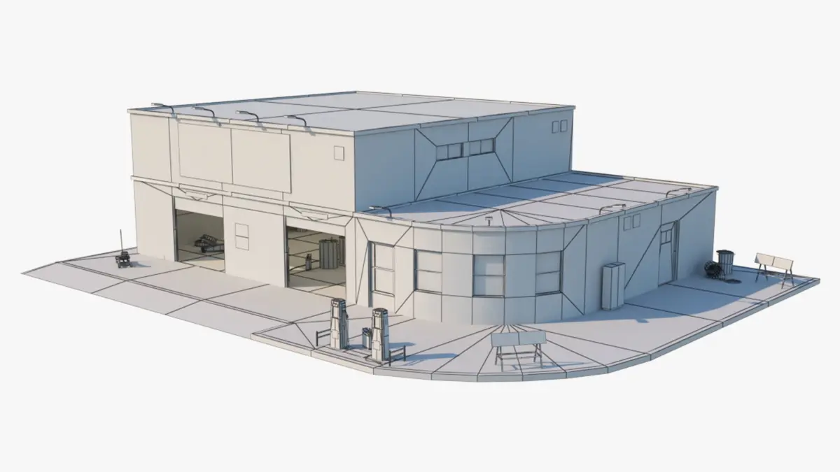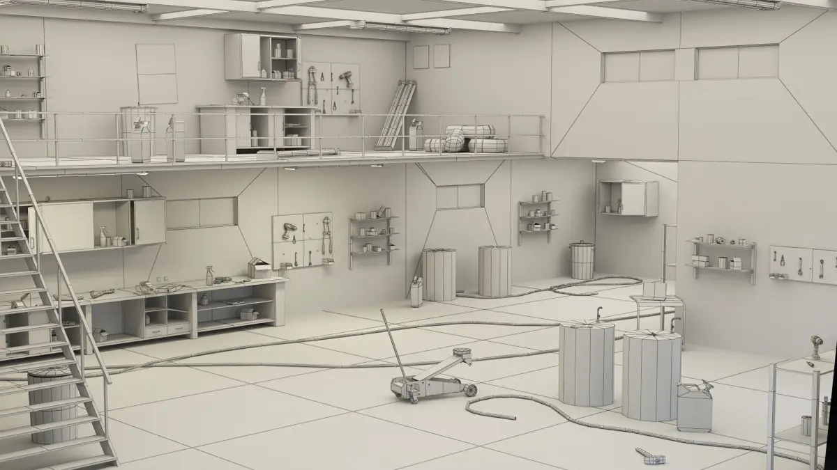 In pack included 3D building with interior and exterior, lights, tools, shelfs, posters, filling devices, trash cans, containers and etc. All models are low polygonal and ready to use.