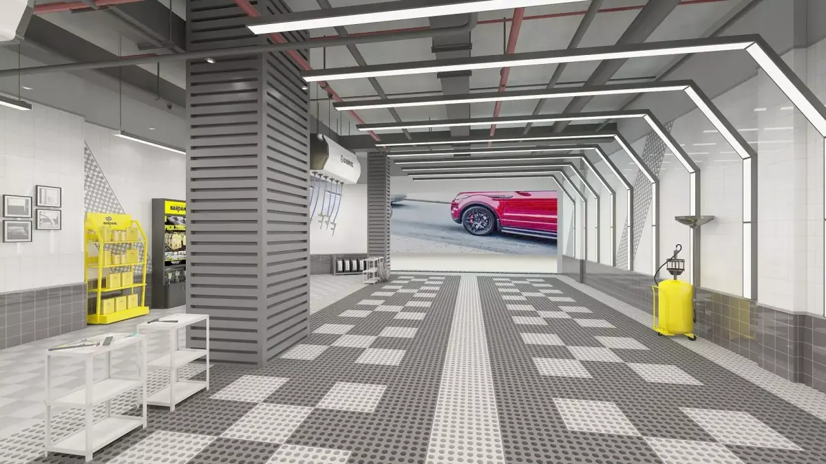 Car service interior. Diagnostic and cleaning instruments, various decorative items.