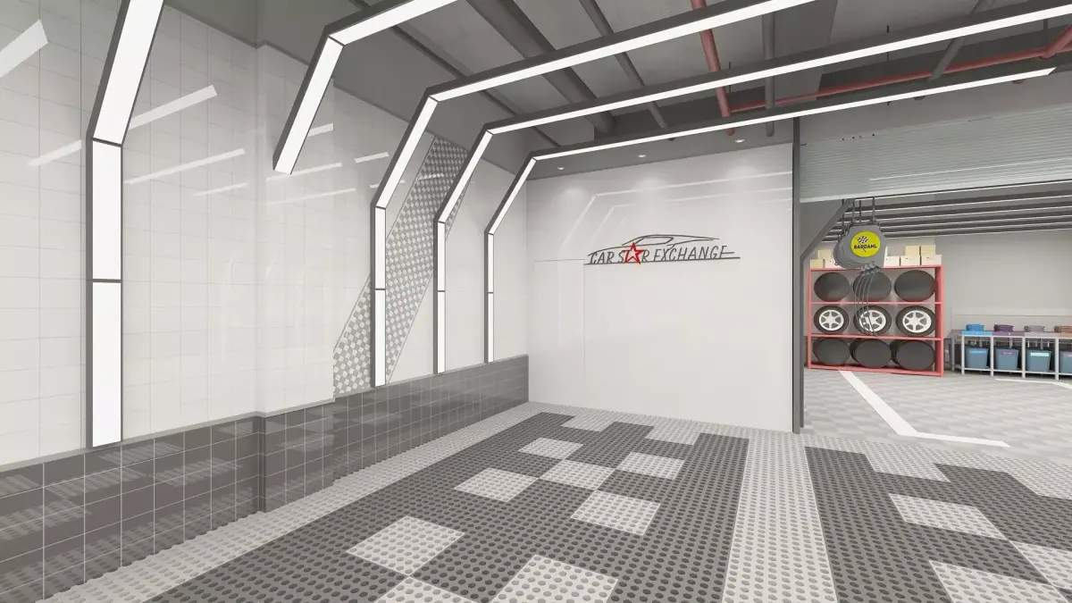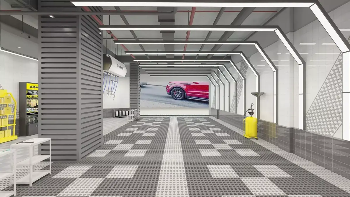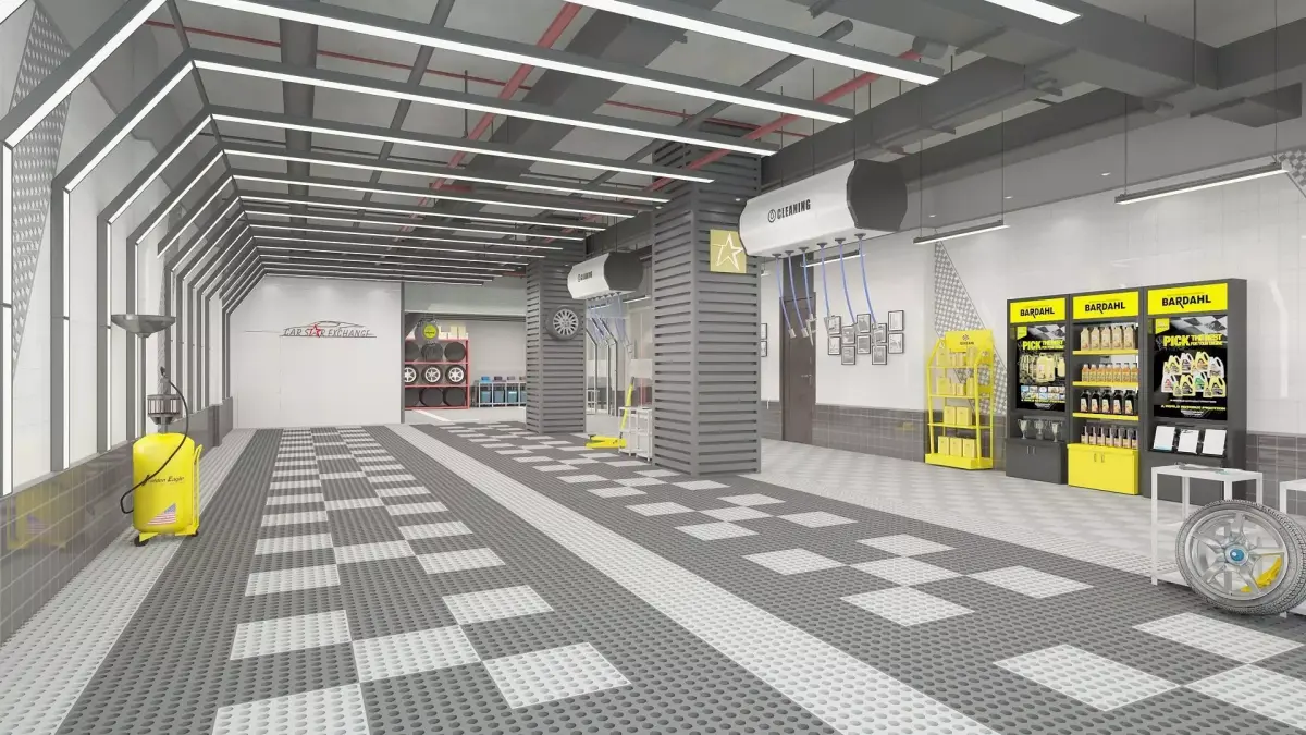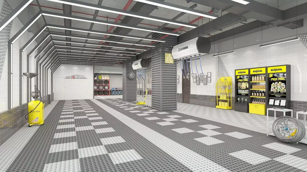 Car service interior. Diagnostic and cleaning instruments, various decorative items.All naming in English.