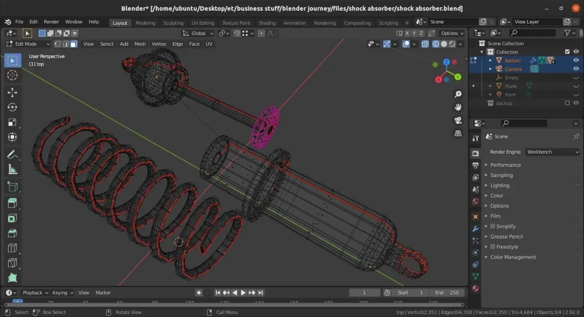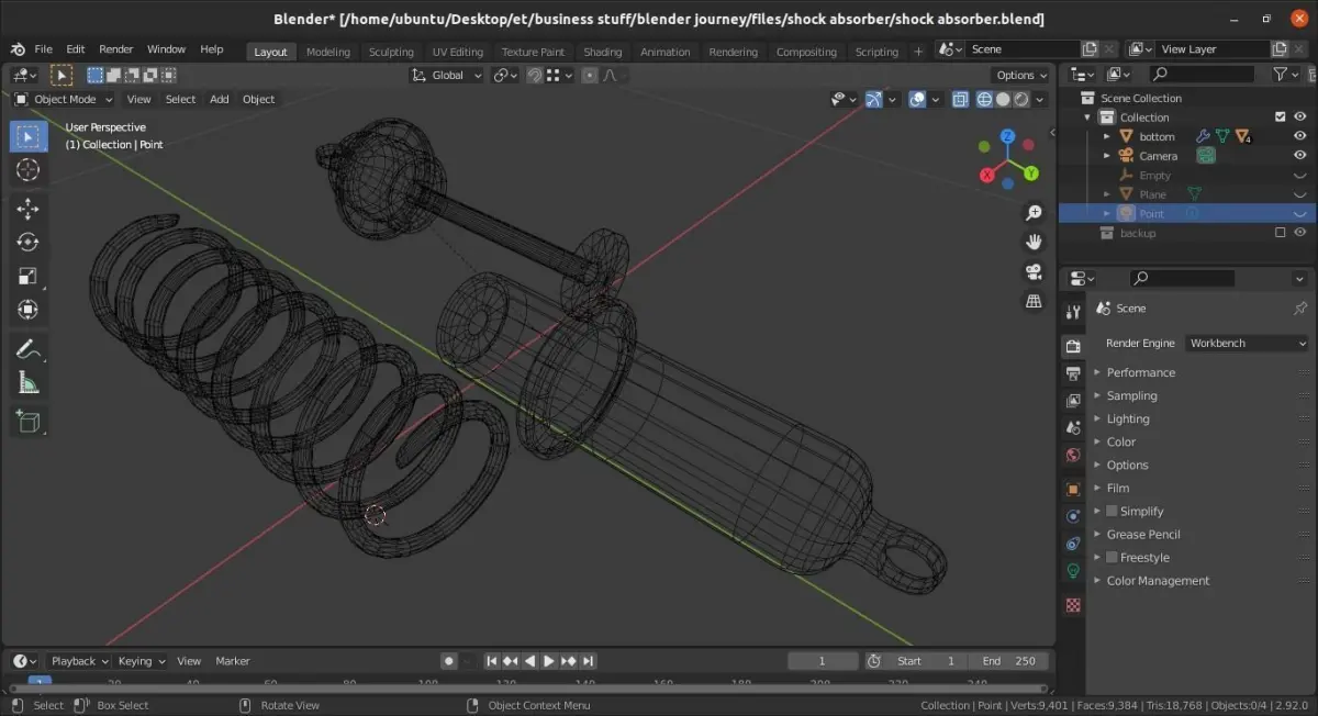 simple model of a shock absorber for .blend file:there is a collection named backup . there is a copy of the spring which the screw modifier is not applied and you can change the spring depending on your project . in order to make the model a little bit more simpler !!! there might be some mesh that you might have to use multiple materials for one object to get better result .