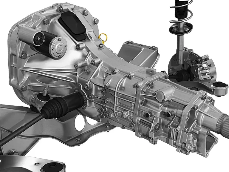 Accurate extremely high definition undercarriage model of a 4x4 car with detailed gearbox, driveshaft, suspension and brakes.