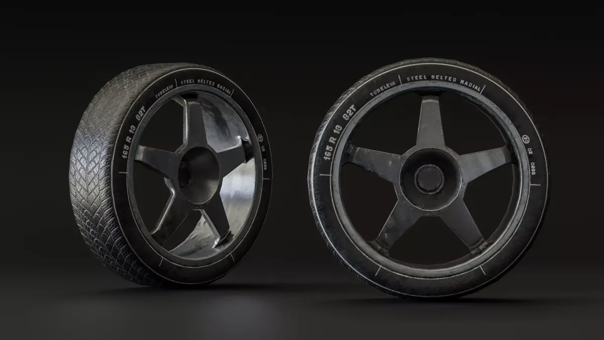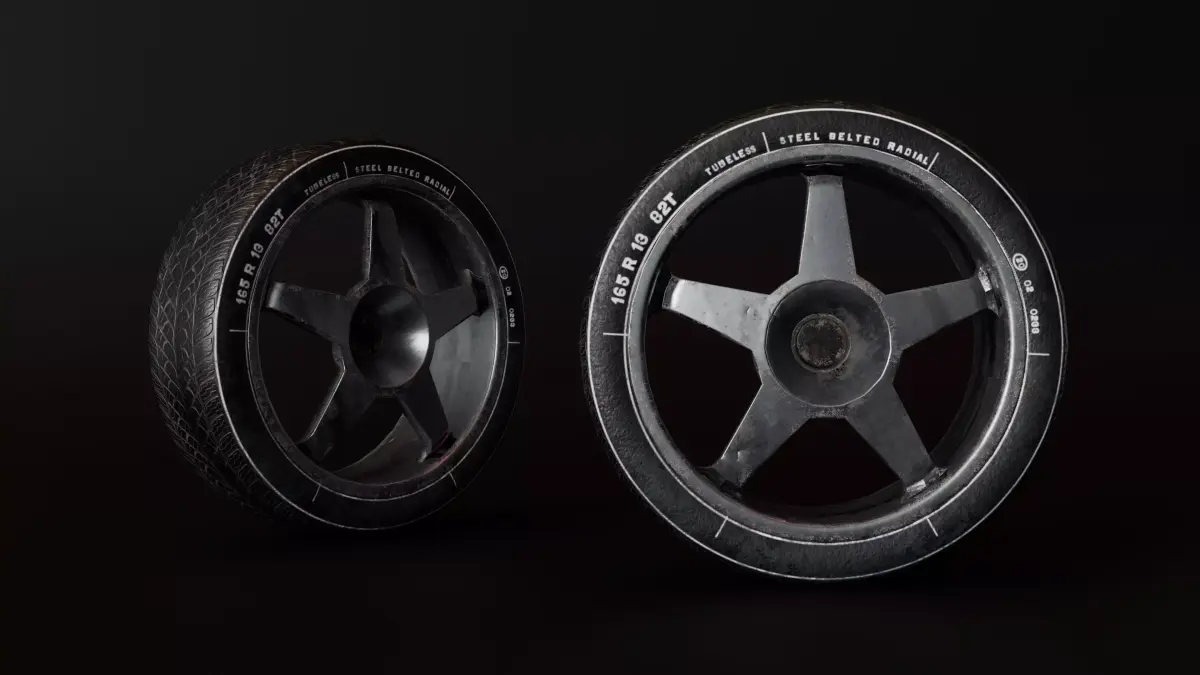 Car wheel 3D model (R13) including tire and rim, designed for real-time applications, games, and automotive visualization.