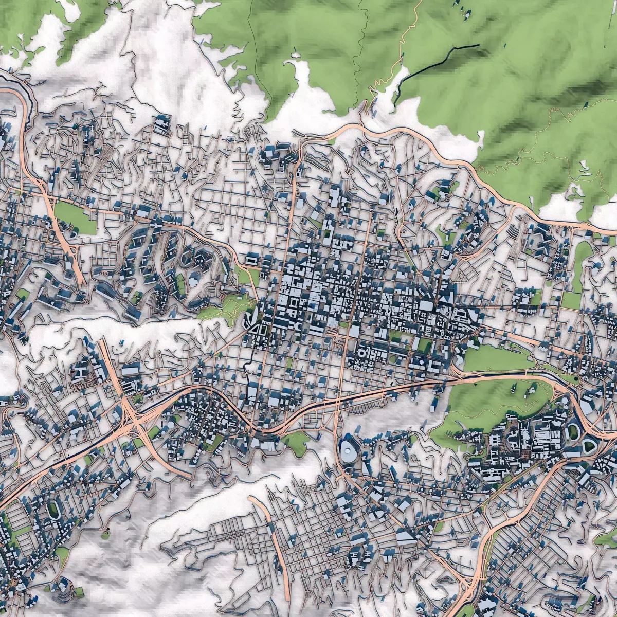 High-quality 3D city map of Caracas, Venezuela, suitable for visualization, urban presentations, and 3D printing projects.The model is clean, optimized, and organized into separate elements for easy editing.