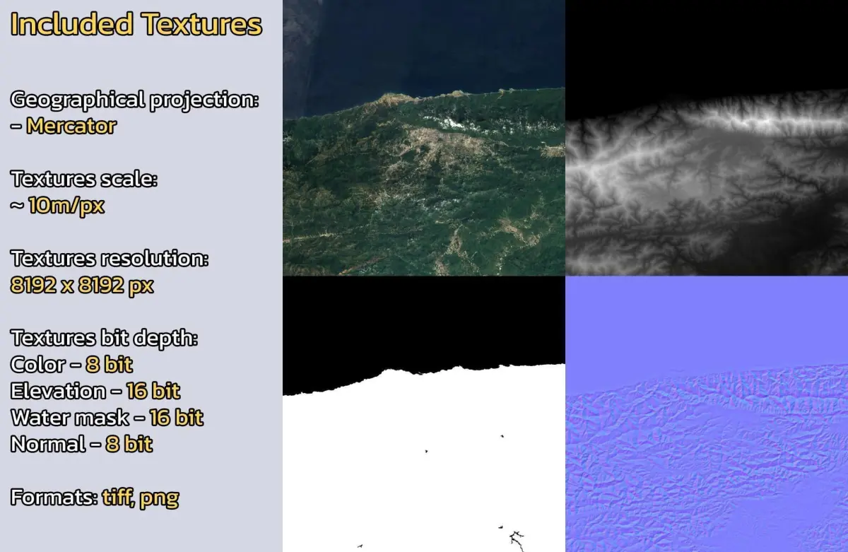 Warning: minor clouds/artifacts may be present on the diffuse color satellite texture due to the nature of the dataset. Check product images.