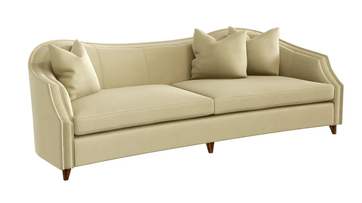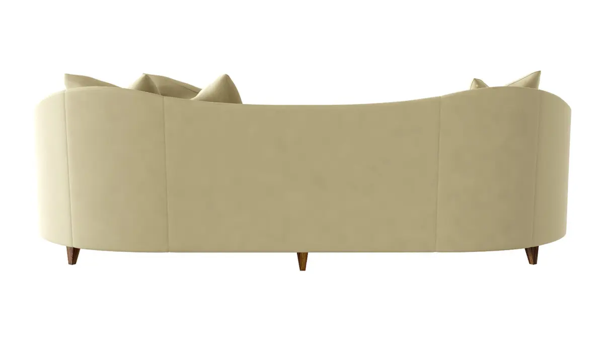 Dimensions: 101.5W x 43D x 32.5H (256x109x83 cm)seat height: 19.75 arm height: 25.5Features:A beautifully flowing form with soft curves and clean-lines. Seams to Me captures todaystraditional styling. Note that the arm movement varies from thick to thin, giving the sense offluidity and adding to its already alluring presence. Upholstered in a soft camel velvet with blushundertones, welt-less seams are contrasted and styled in a sophisticated palette of Dior grey.Construction:Ultra Plush Down Cushion, 8-Way Hand Tied Seat, Feather Down Pillows