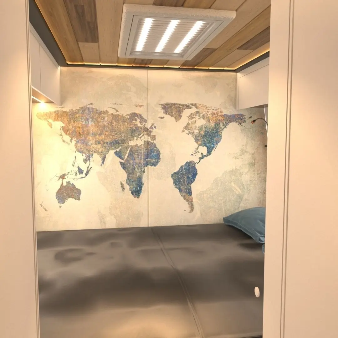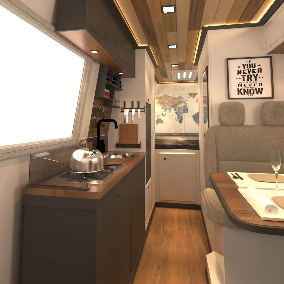 caravan design, interior design, living space, kitchen and shower, large bed, luggage space water tank, skylights, interior equipment and accessories, seats, scale drawing.