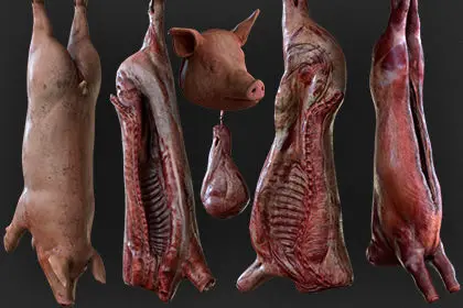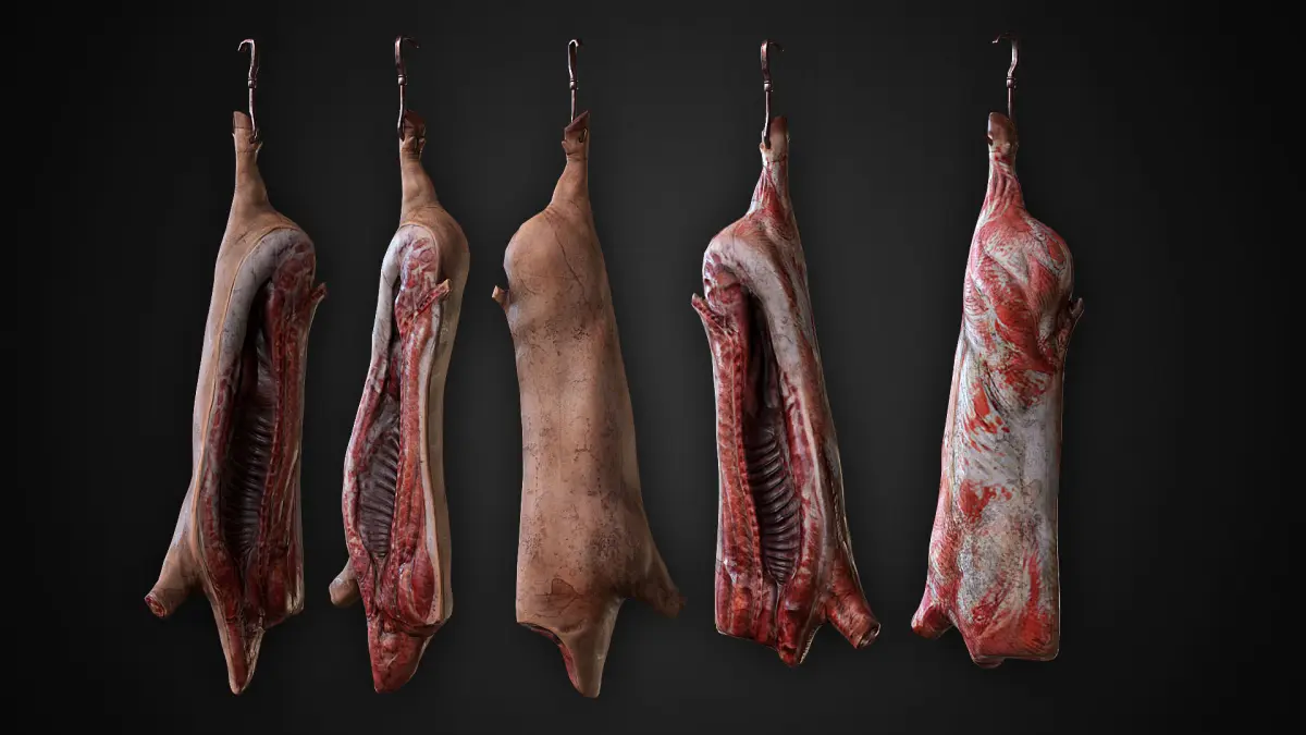 High-quality realistic low-poly 3D models of Сarcasses:Beef_BodyBeef_HeadBeef_LegBeef_SliceBeef_Slice02Hook01Hook02Pork_FullPork_HeadPork_NoSkinPork_Slice_NoSkinPork_Slice_SkinRam_BodyRam_Head