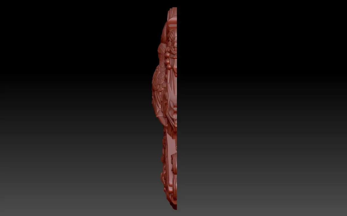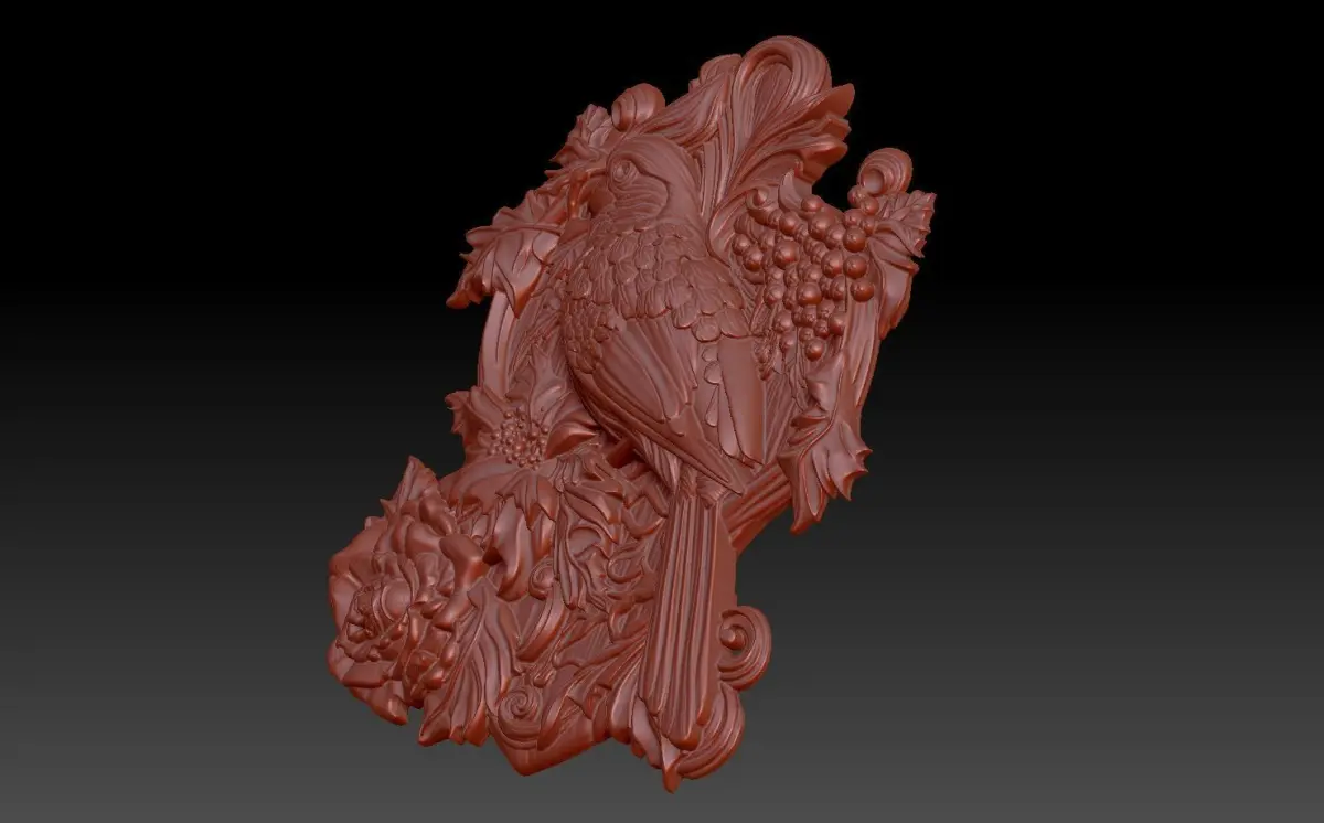 A 3D model of a bas-relief with an image of a bird - a red cardinal. The bird is sitting on a branch, among beautiful flowers and plants. The work is suitable for 3D printing and CNC machine tools.