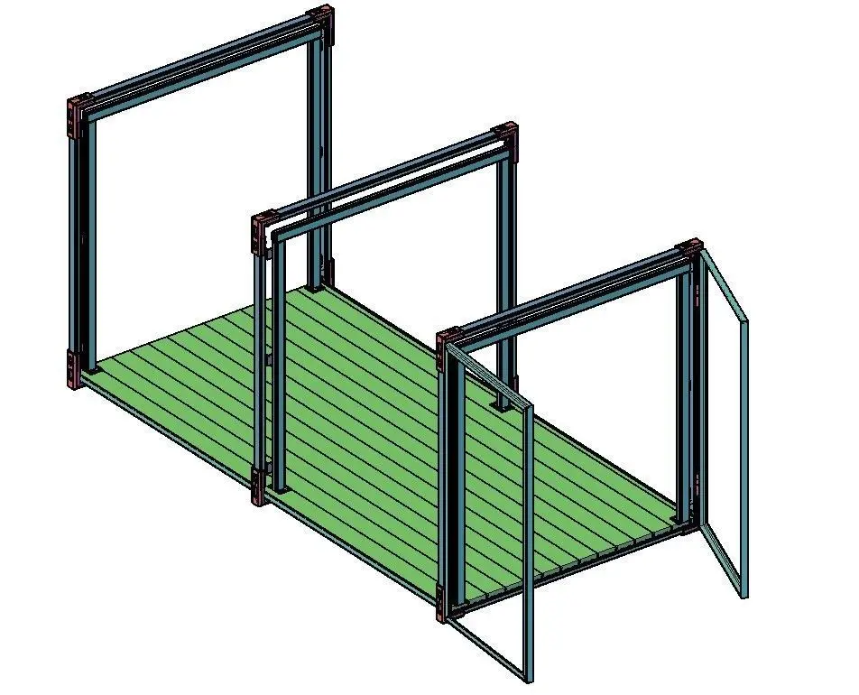 A cargo container measuring 4x2x2 meters. It is used for storing and transporting things by freight transport. It is made of steel profile pipes, the walls are made of profiled sheet, the floor is wooden.