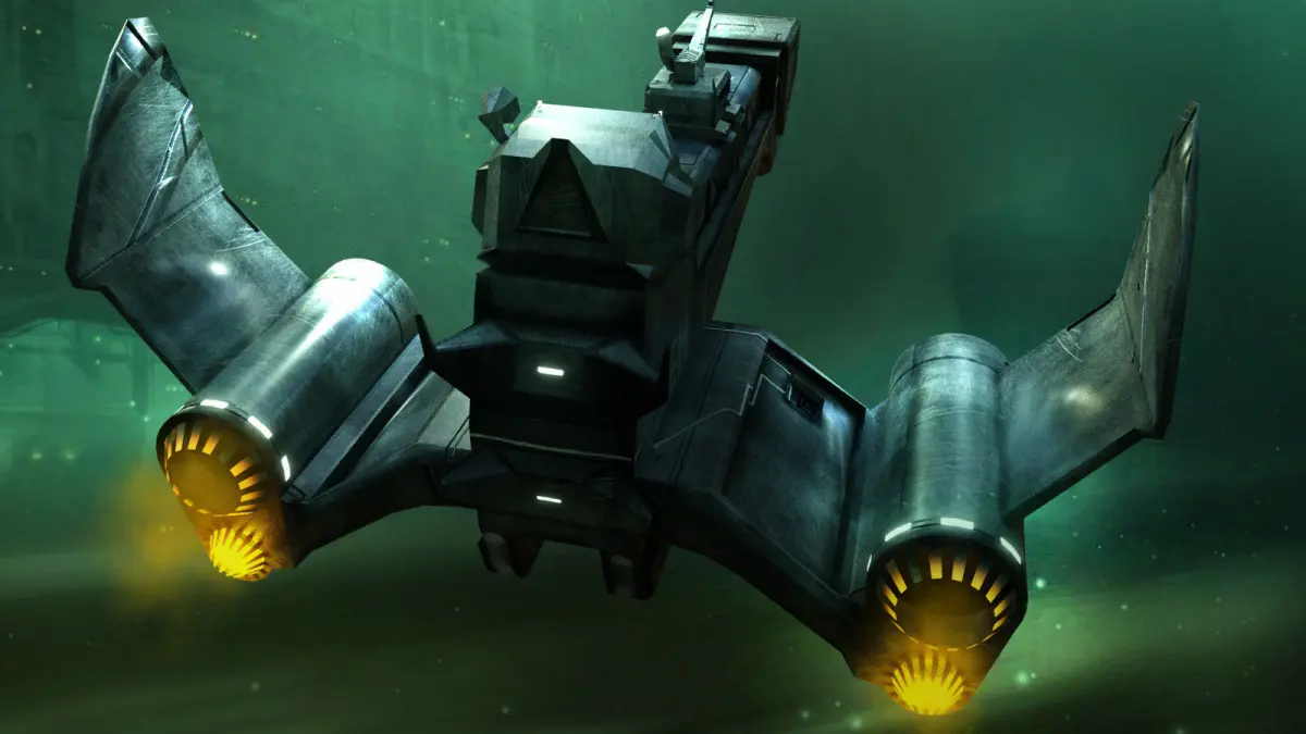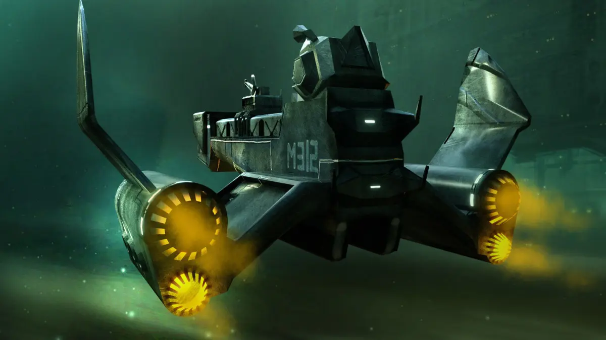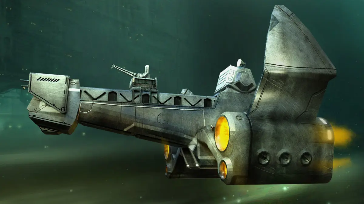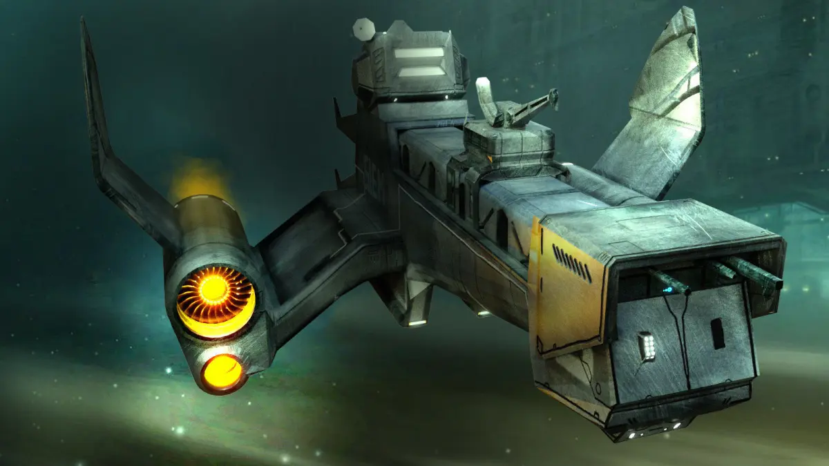 Cargo spaceship in medium sized sci-fi style. Worn state of the ship