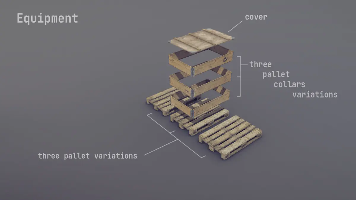 - (three variations for Pallets) + (three variations for Pallet Collars) + (Cover) (size 1200mm - 800mm - 145mm)