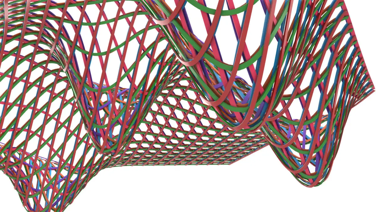A Pavilion Structure with an alien wavy form that has 5 parabolic scifi peaks, four of them used as stabilization columns on the ground, the middle parabolic deformation is elevated from the ground as a decoration element at the center of the structure, the structure is sandwich-like system with layered beams directed to three directions with two layers for each, 6 layers with different colors were used, preferable material is wood due to it’s suitable cost and flexibility.