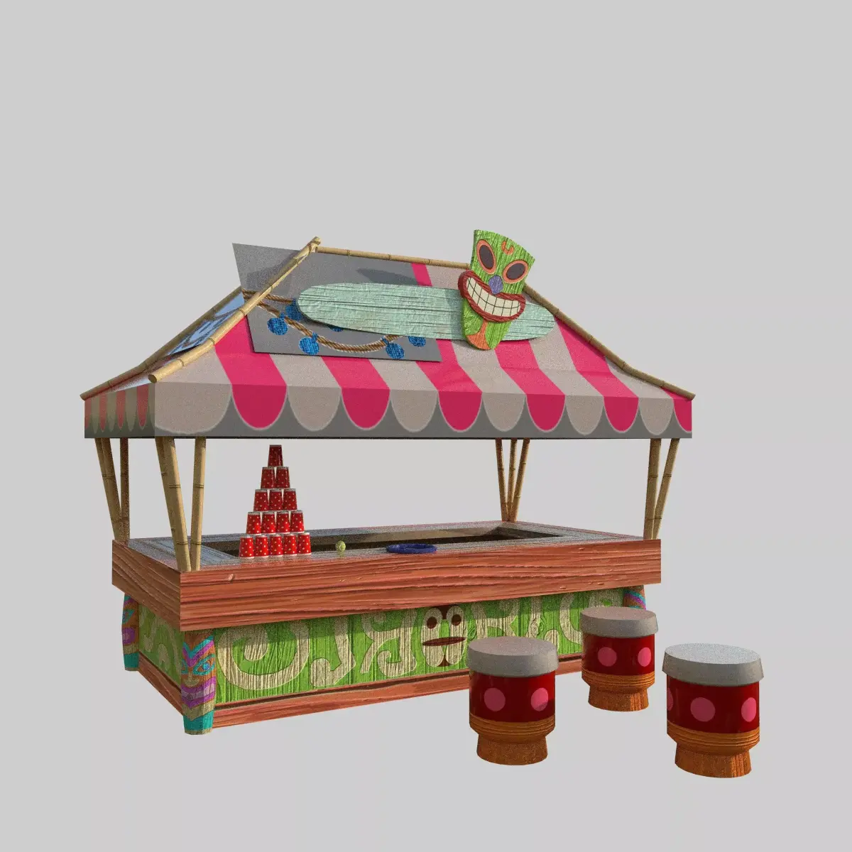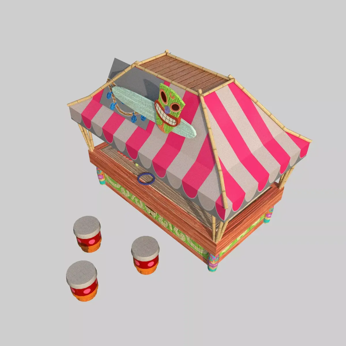 This detailed model features a striped canopy, bamboo frame, decorative tiki mask, stools, and stacked cans — capturing the cheerful essence of a classic carnival game stall. Ideal for use in games, VR worlds, theme park simulations, or stylized 3D animations, this model brings a fun and nostalgic atmosphere to your scenes.