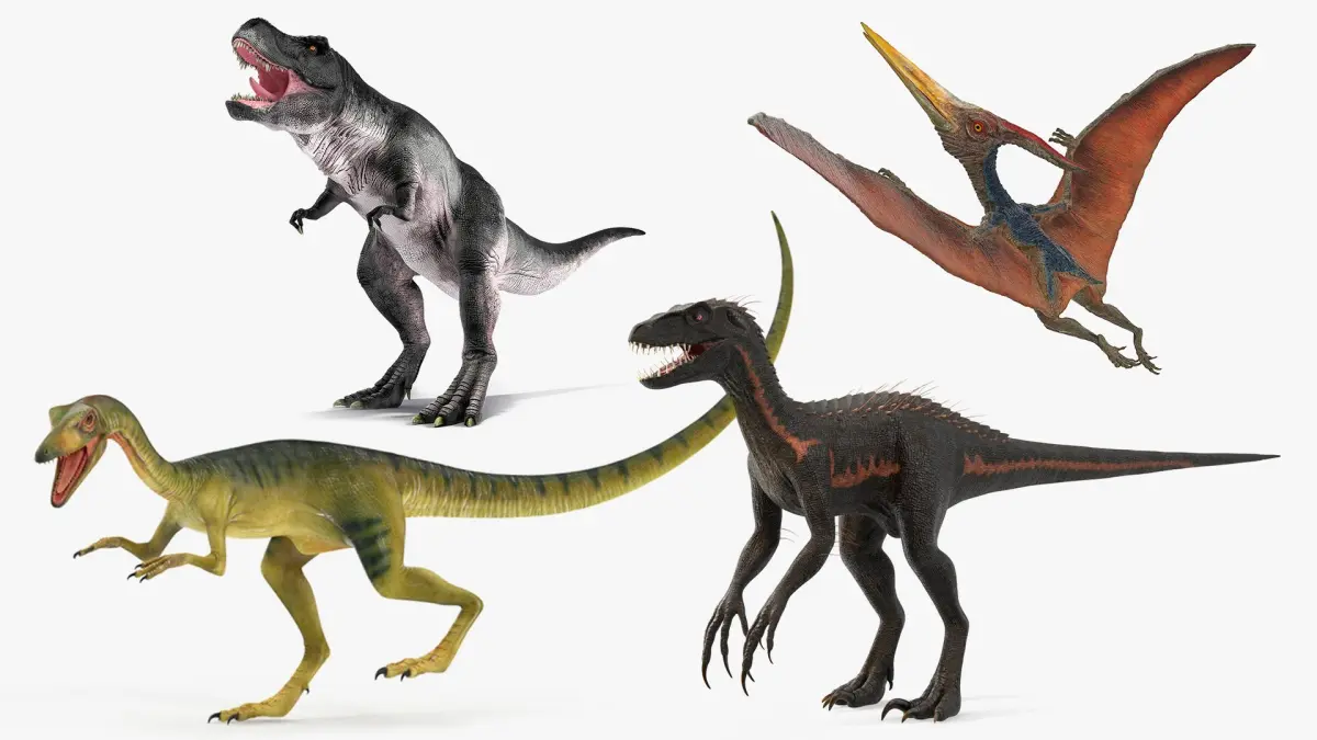 Each dinosaur in the collection is meticulously modeled with anatomically accurate proportions and textured skins. The set includes a fierce Tyrannosaurus rex, a spiny raptor-like creature, a nimble green theropod, and a flying Pteranodon—all designed with realistic muscle definition, expressive features, and high-quality rigging. These assets are optimized for seamless integration into animations, VR experiences, and game engines.