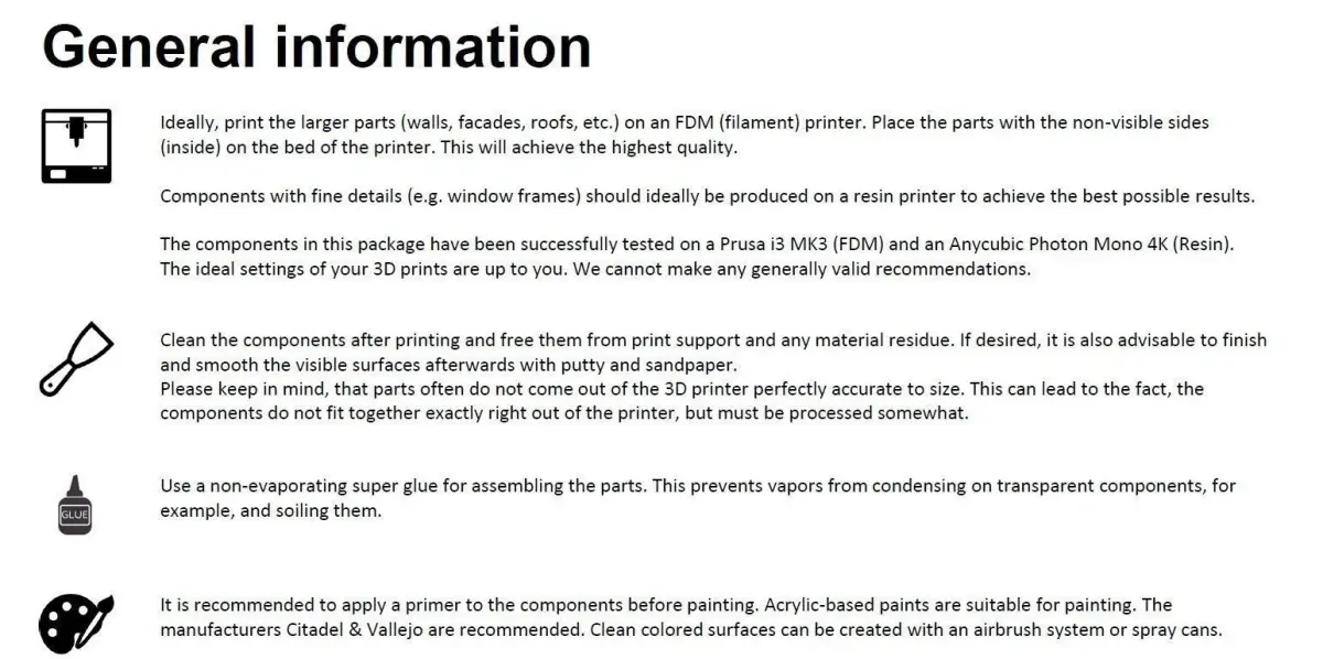 Ideally, print all parts on an resin printer. Place the parts with the non-visible sides (inside) on the bed of the printer. This will achieve the highest quality. The components in this package have been successfully tested on a Prusa i3 MK3s (FDM) and an Anycubic Photon Mono 4K (Resin). The ideal settings of your 3D prints are up to you. We cannot make any generally valid recommendations.
