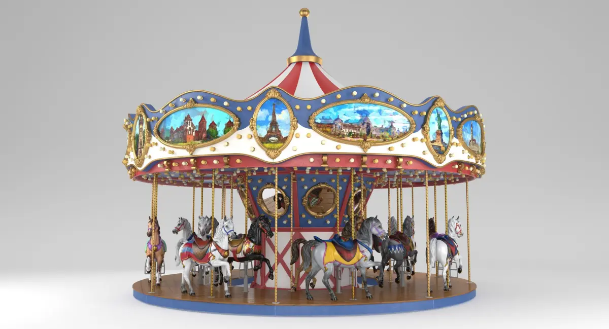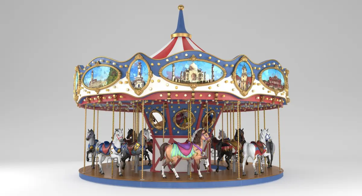 This Carousel is a high quality model. The model has a fully textured design that allows for close-up renders, and was originally modeled in 3ds Max 2016 and rendered with V-Ray.