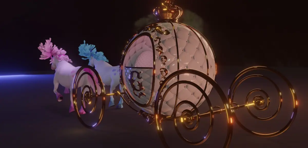 Layers: 0: Carriage 1: Horses with harness 2: Demonstration ground with curve (motion path) for carriage. For ground, Shadow Catcher enabled.
