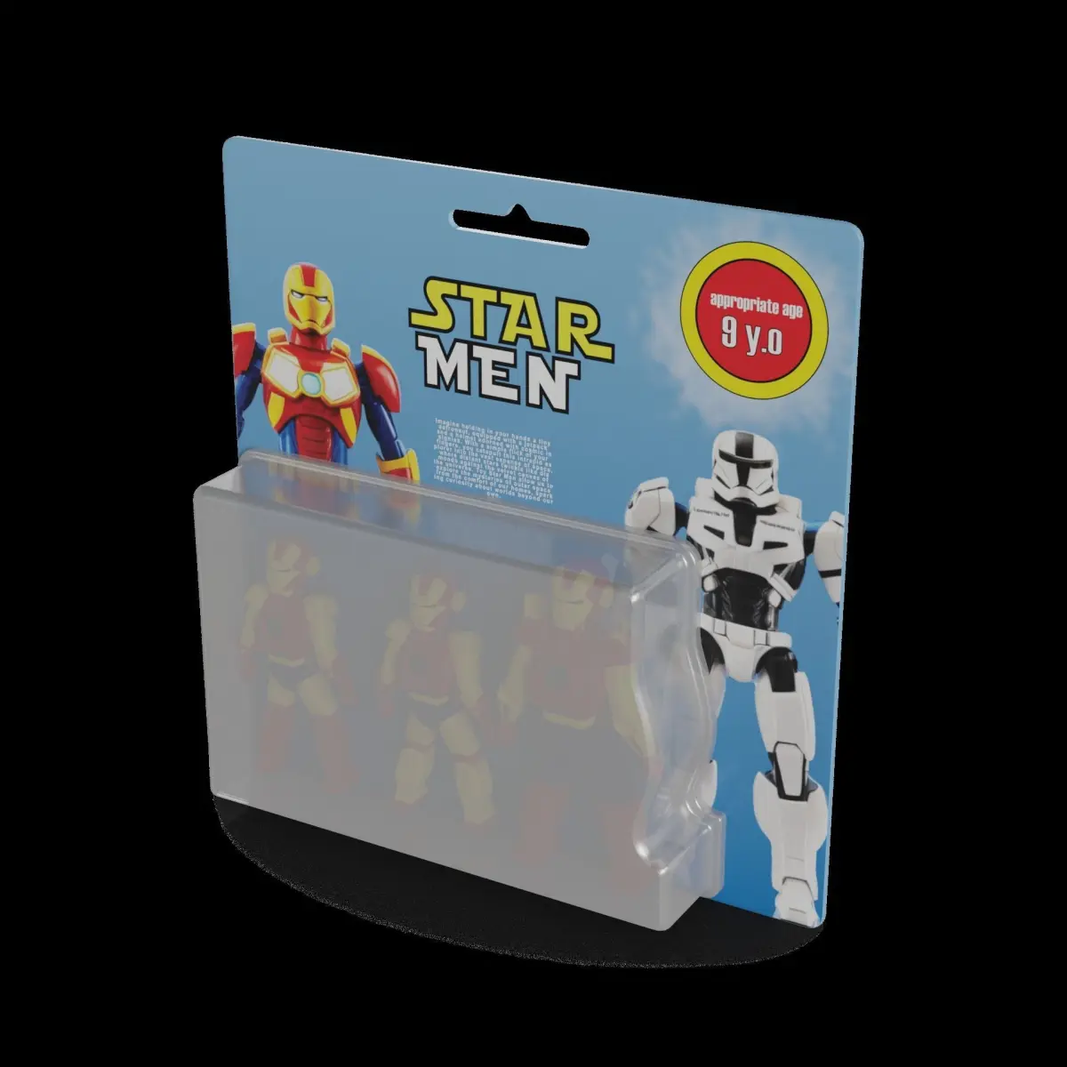Action Figure Set: This action figure set includes three figures in different poses. The packaging is a colorful blister pack with a cardboard backing. The front of the packaging showcases the figures, while the back provides information about each character, including their names and special abilities. The packaging also includes a label with a warning symbol indicating the appropriate age range for the toy.