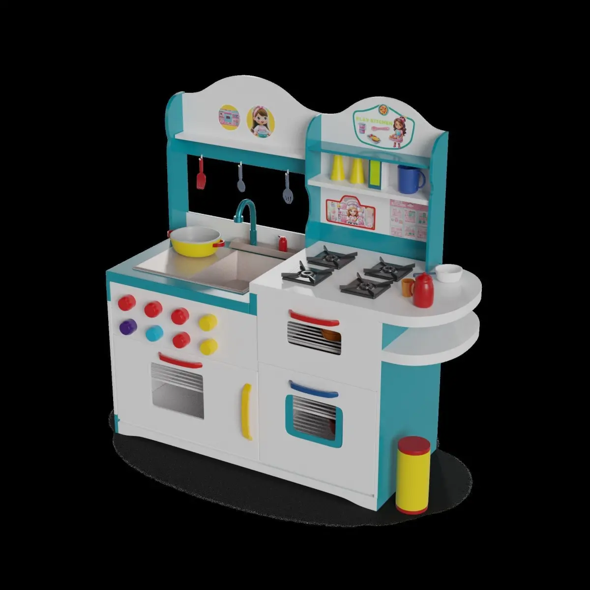 Play Kitchen Set: This play kitchen set includes a stove, refrigerator, sink, and various cooking utensils. The packaging is a large, colorful box with a handle for easy carrying. The front of the box showcases the play kitchen set in action, while the back provides information about the different components included. The packaging also includes a label with a choking hazard warning and a suggestion for parental supervision during play.
