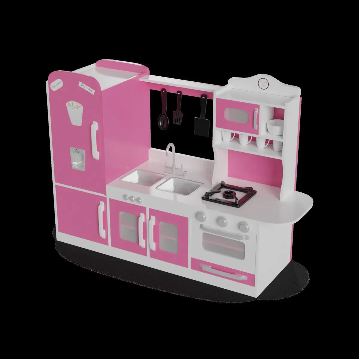 Play Kitchen Set: This play kitchen set comes in a vibrant pink color. The packaging is a large cardboard box with a handle for easy carrying. The box features a label with the product name and a picture of the kitchen set. Inside the box, you'll find a stove, refrigerator, sink, and various kitchen accessories. The set is made of durable plastic and is designed to provide hours of imaginative play.