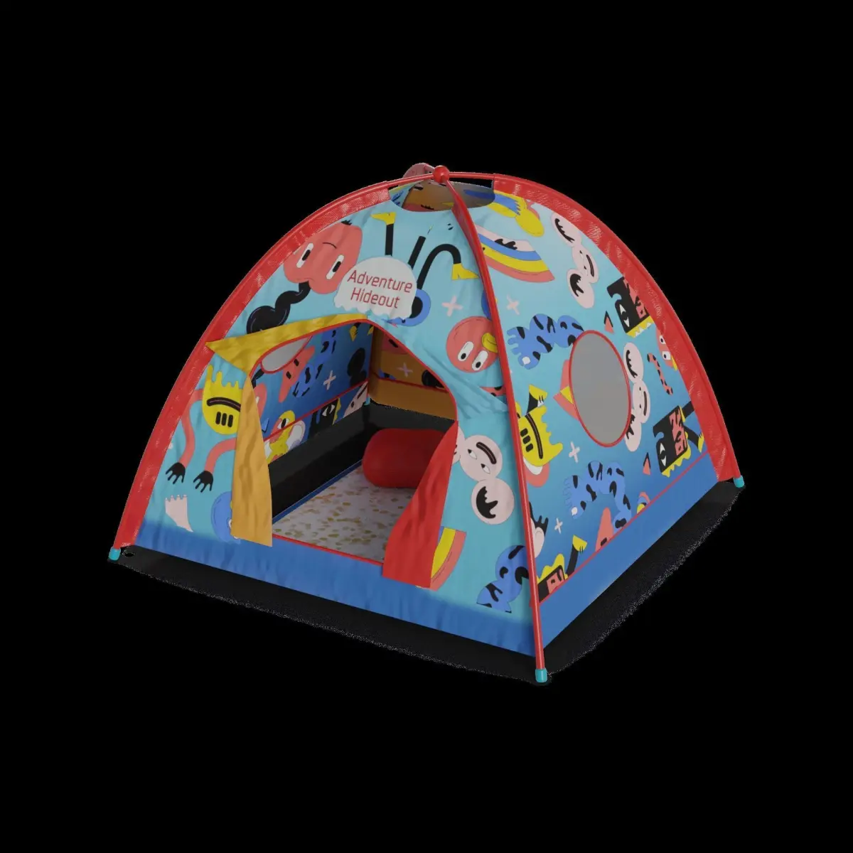 Play Tent: This play tent is a magical hideaway for imaginative play. The packaging is a compact carrying bag with a handle for easy storage and transportation. The tent is made of durable fabric and features a colorful design with playful patterns. It can be easily assembled and disassembled for indoor and outdoor use. The packaging includes a label with the text Adventure Hideout and a graphic of children playing inside the tent.