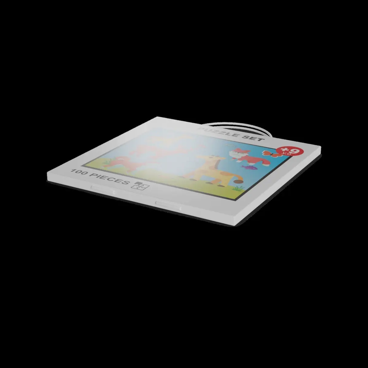 Puzzle Set: This puzzle set includes four different puzzles featuring colorful animal illustrations. The packaging is a sturdy cardboard box with a handle for easy carrying. The front of the box showcases the completed puzzles, while the back provides information about the number of pieces in each puzzle and the recommended age range. The packaging also includes a label with a choking hazard warning and a suggestion for parental supervision during play.