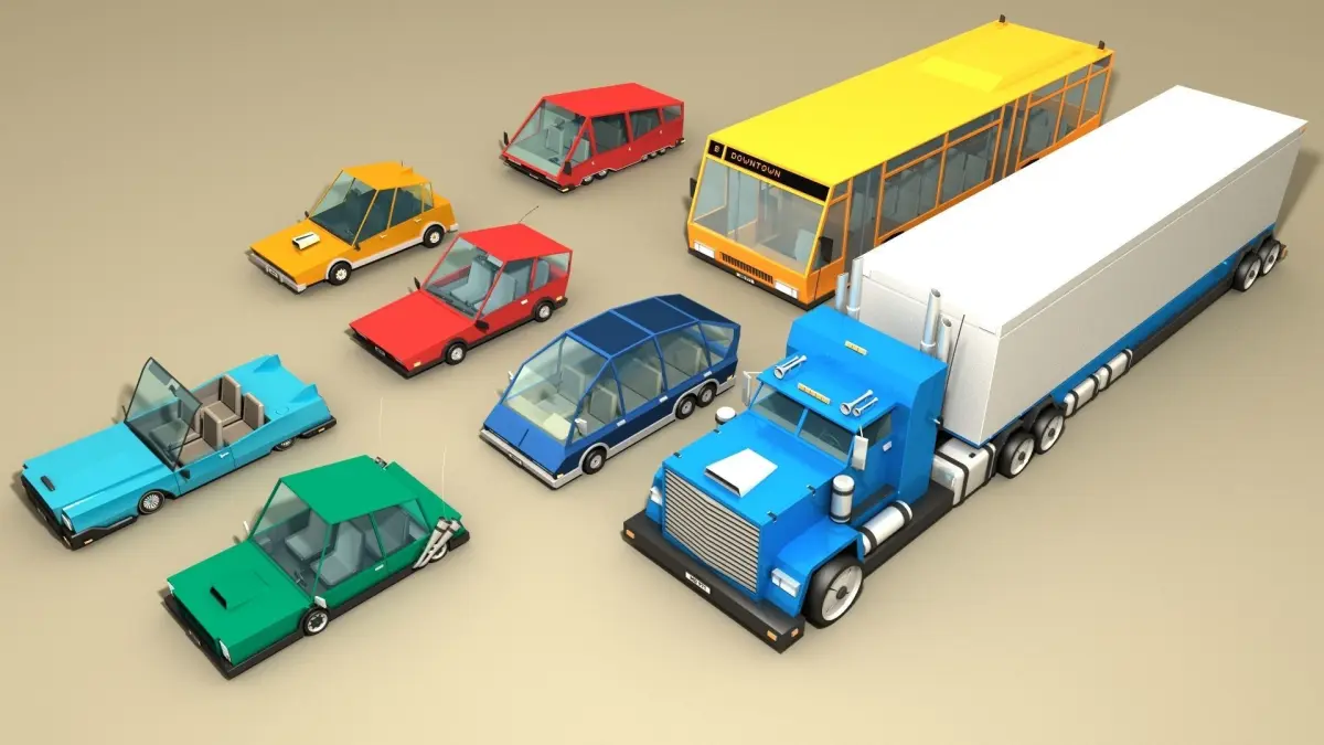 Different cars collection, including interior with seats, steering wheel and gearbox. All surfaces are neatly divided and named (except for PBX format). All parts are separated and accessible individually: body, hood, engine, glasses, bumpers, wheels, radiator, lights, mirrors, exhausts, antennas. Real size.