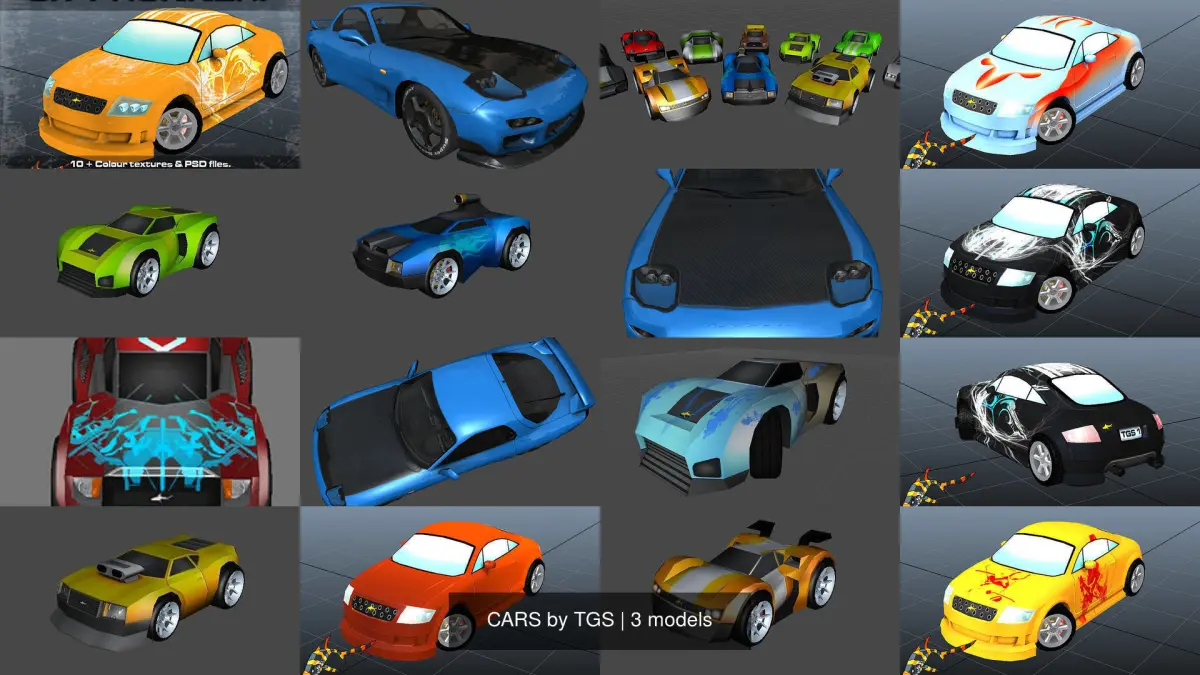 Large collection of current cars created by Tiger Shark Studios. These can be used for mobile, online and console games. These cars can be used as vehicles in games menu systems.