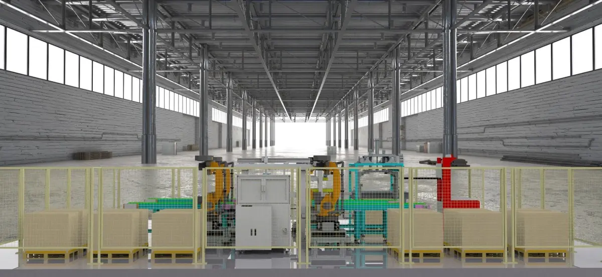 The production includes carton unpacking, manipulator loading and unloading, assembly line transportation.