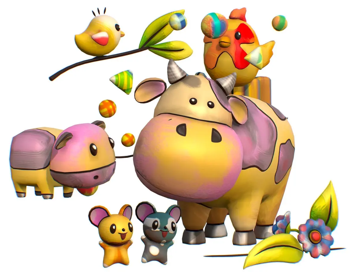 Cartoon 3D illustration Cow Mouse Rooster Chick Low-poly 3D model