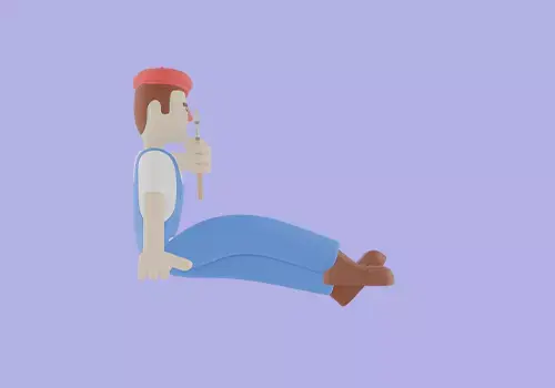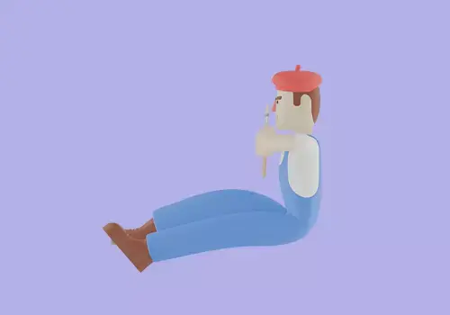 This stylized 3D male painter character depicts a cartoon artist with an angry, frowning expression, sitting on the floor with one hand reaching forward while tightly gripping a paintbrush in the other. Perfect for art-themed games, creative animations, VR storytelling, or educational content that requires a dramatic and expressive character.