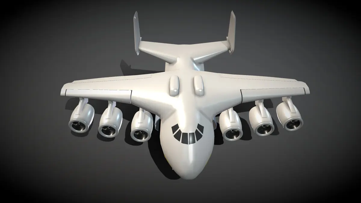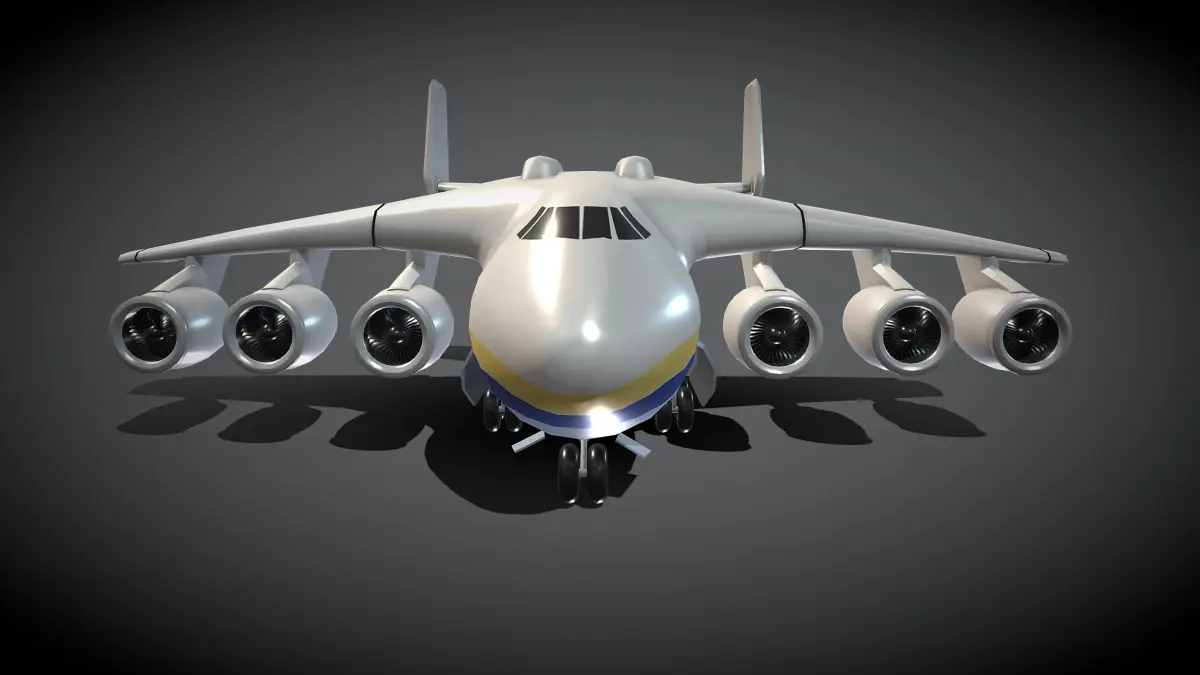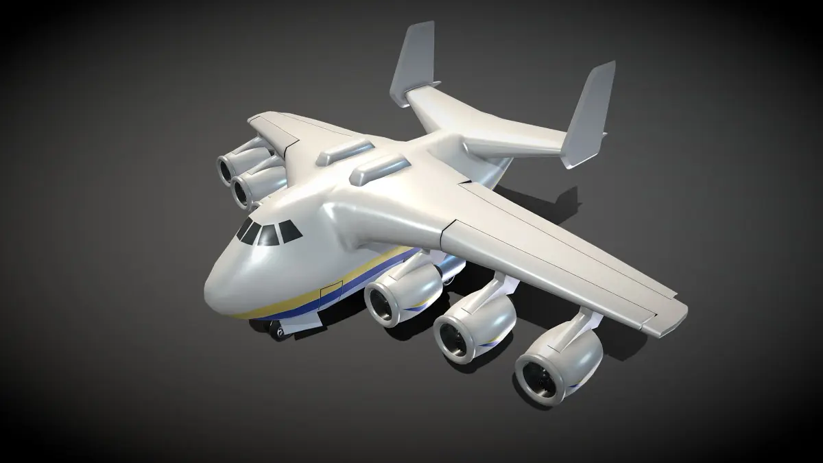 This is a cartoon An-255. The Antonov An-225 Mriya (Ukrainian: Антонов Ан-225 Мрія, lit. ‘dream’ or ‘inspiration’; NATO reporting name: Cossack) was a strategic airlift cargo aircraft designed in the 1980s by the Antonov Design Bureau in the Soviet Union. It was originally developed as an enlargement of the Antonov An-124 to transport Buran-class orbiters, and only one example was ever completed.