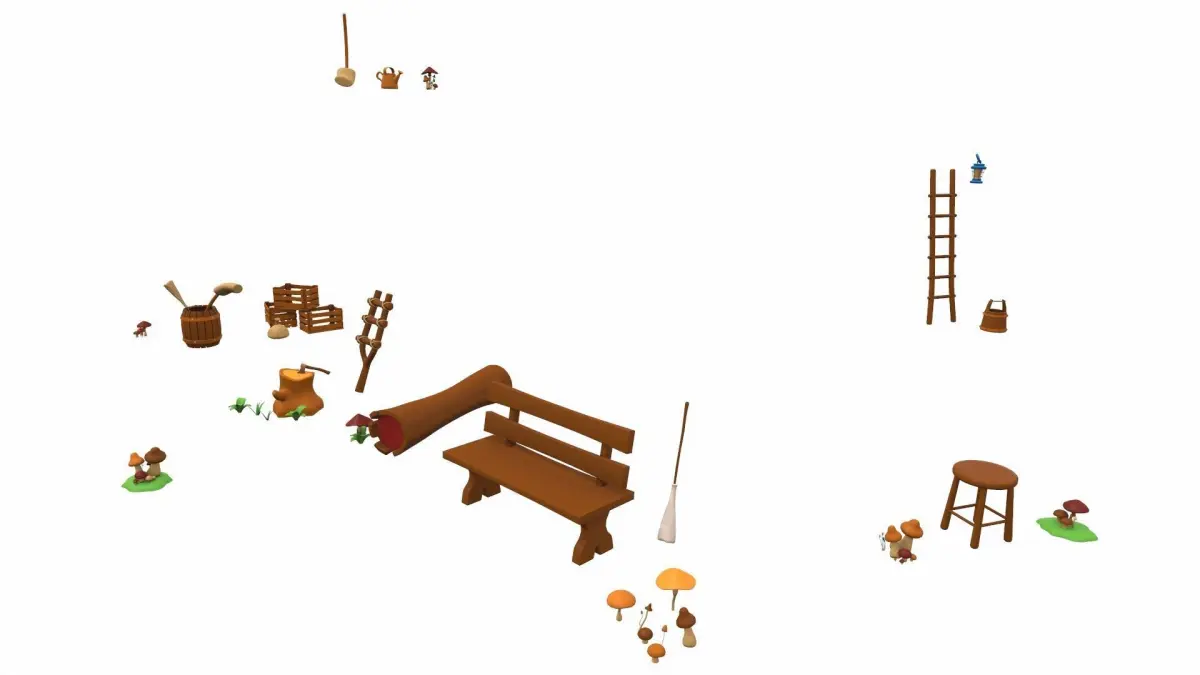 The model consists of three cartoon house and several props and plants (bench, tree stump, broom, axe, bucket, stool, bag, barrel).