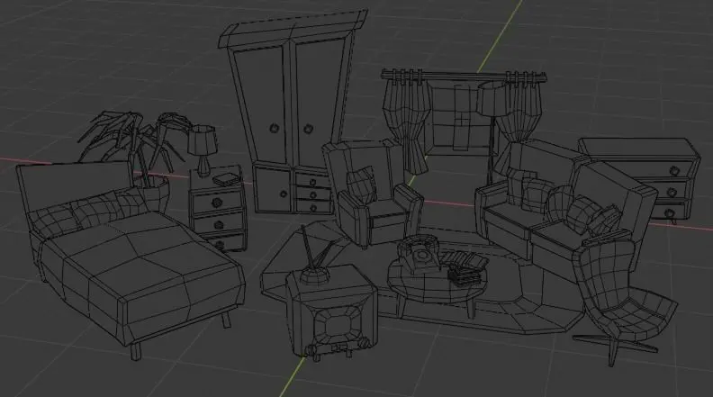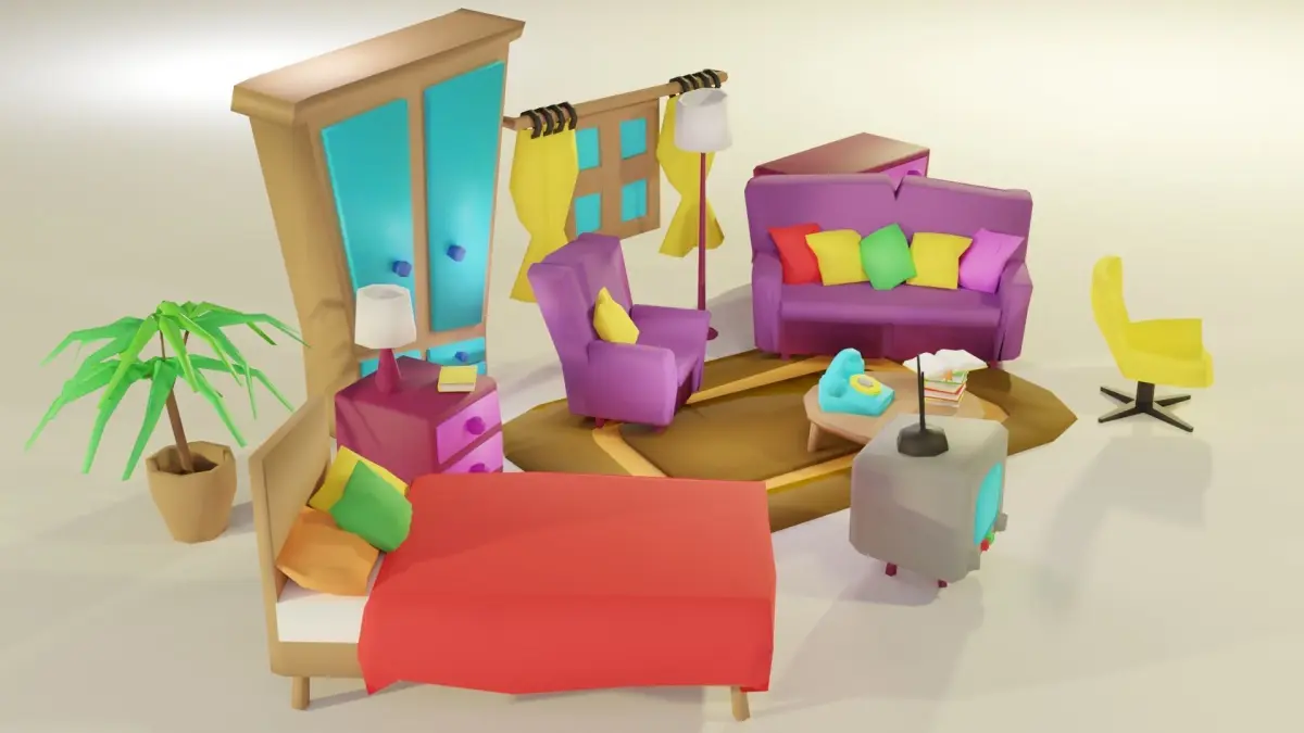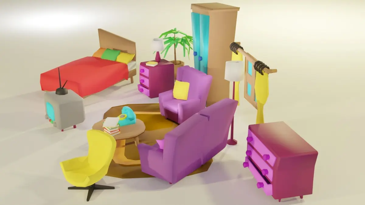 This is a low-poly set of cartoon bedroom and living room furniture and accessories.