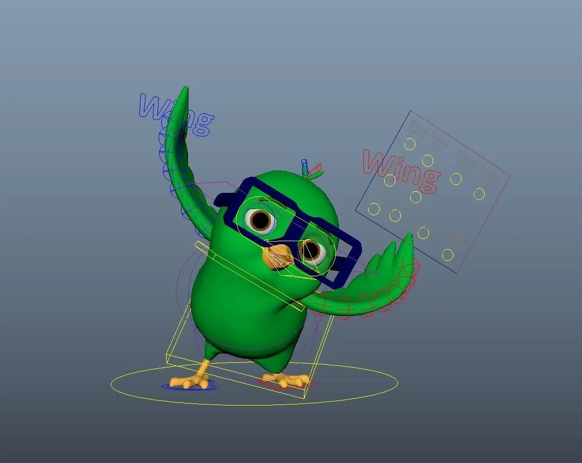 Cartoon deep blue color bird. You can change or add costume props inside the rig.
