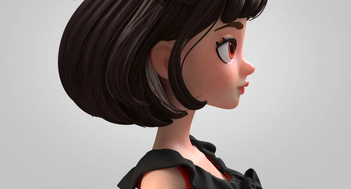 High-quality 3d model of a cartoon brunette in a red dress with black polka dots, ready for close-up and HD renders.
