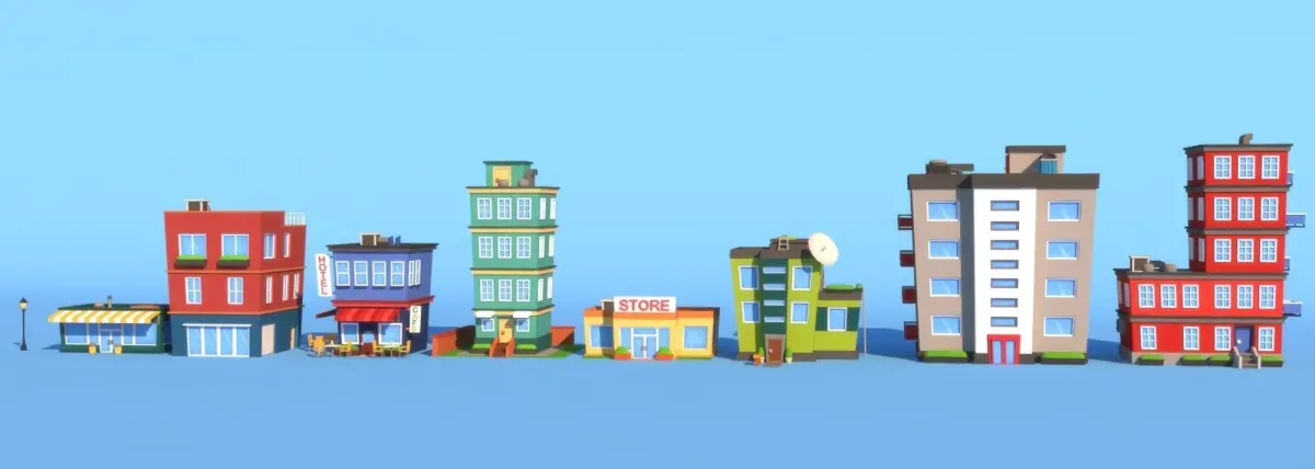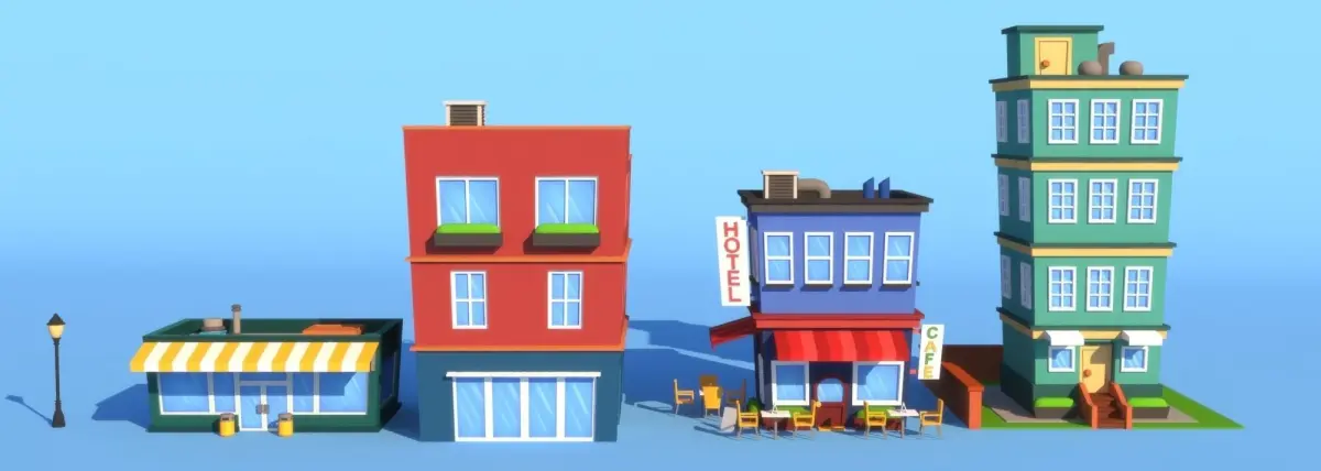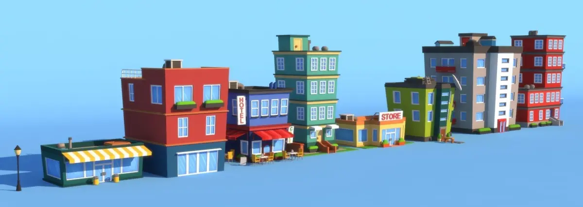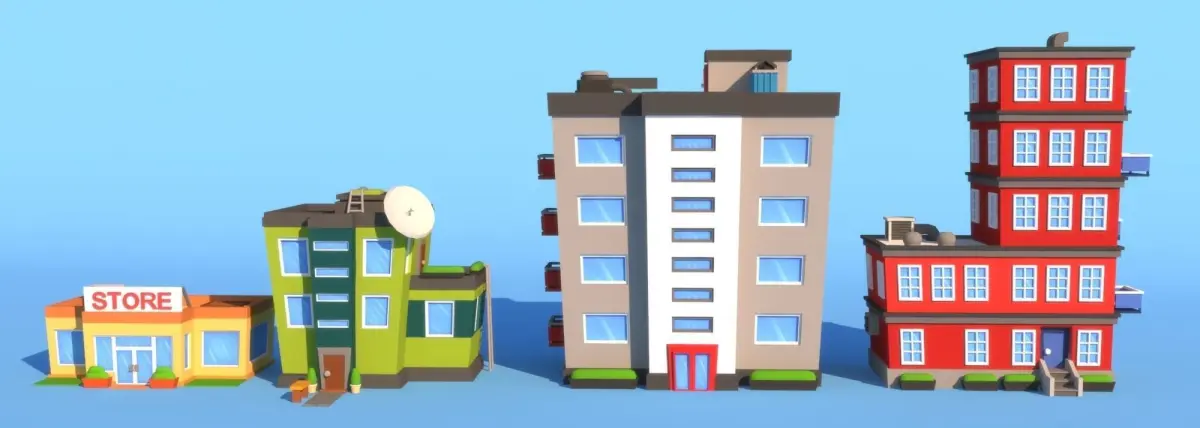 This package contain 8 unique buildings models.All assets unwrapped and textured. Easy to change diffuse color.