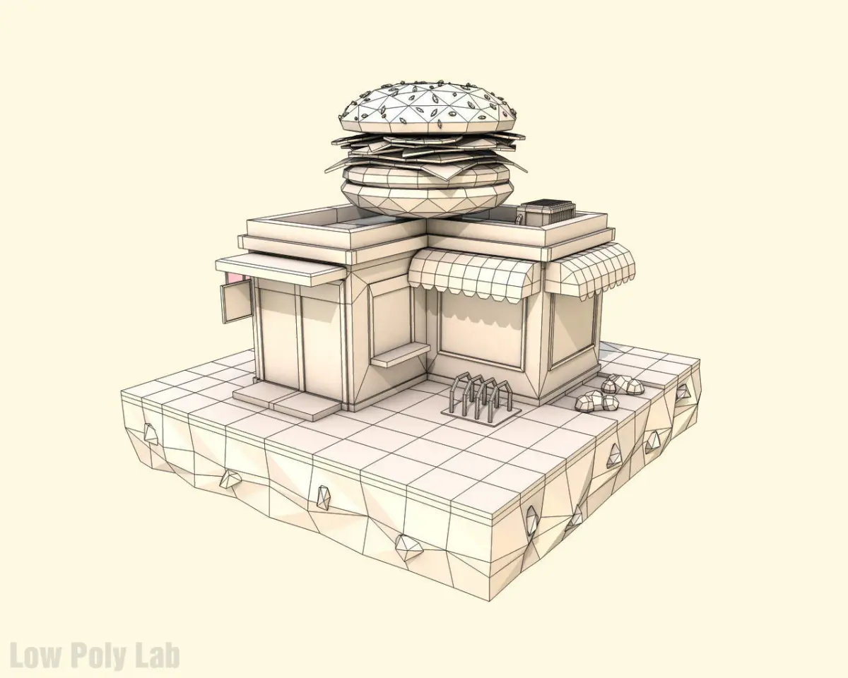 Present to you a low poly burger cafe. The features of the 3D model are the big burger on the roof and interior inside cafe. Accurate forms of polygonal shapes, give this model more simplicity and elegance. The model was originally created in Cinema 4D. Rendering standard.