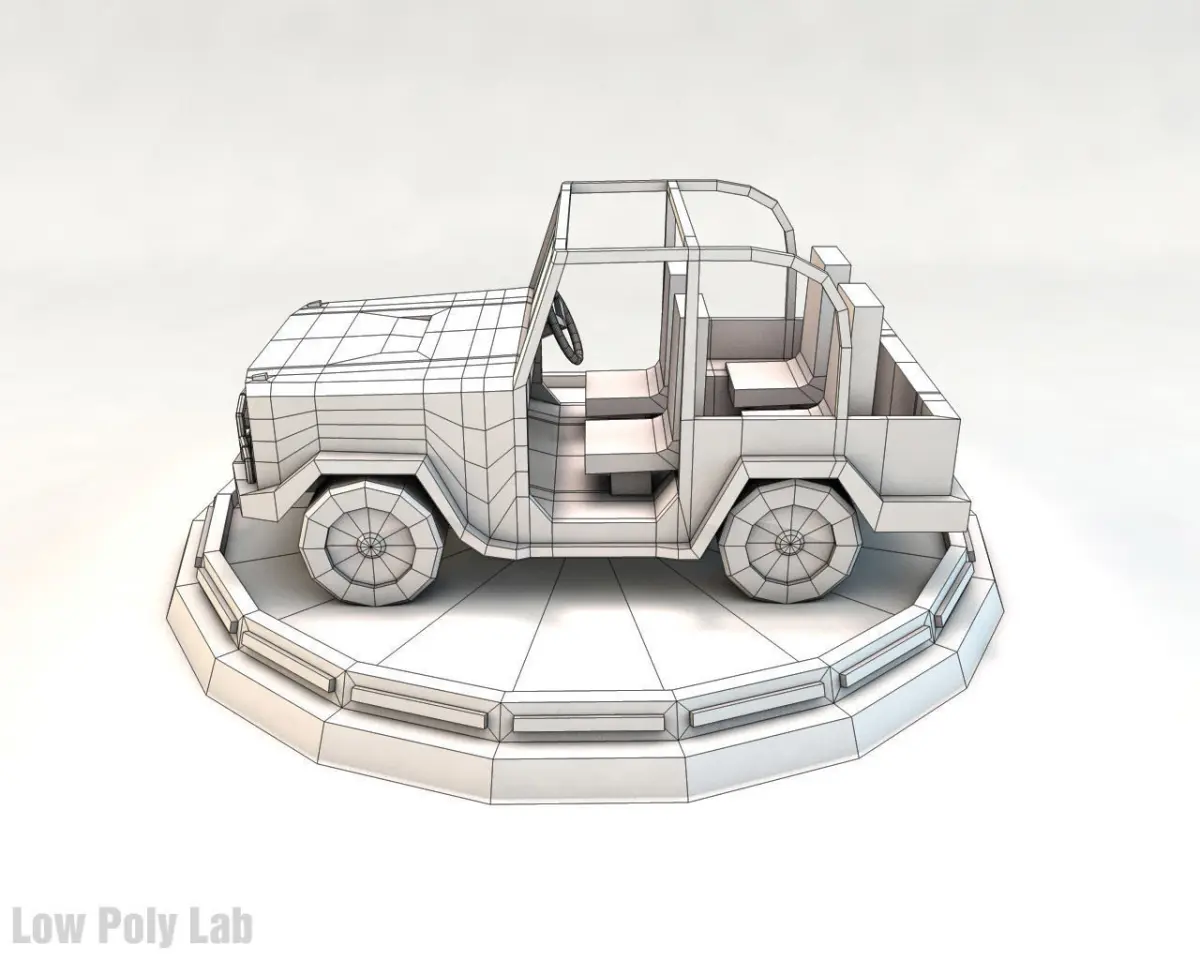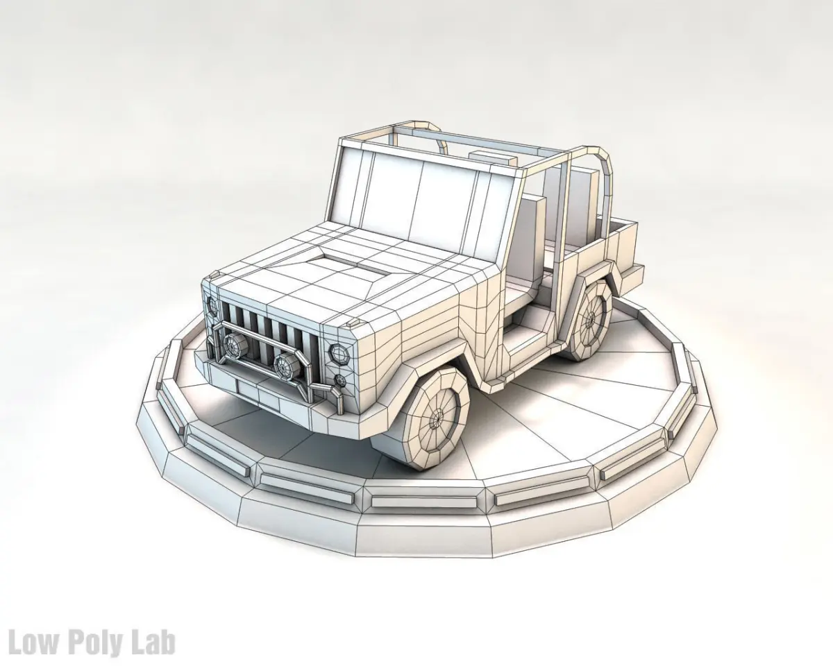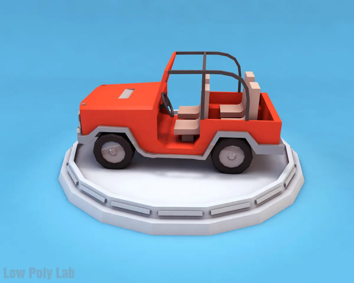 Present to you a low poly jeep in red colors. The 3D model was created in minimalist style with acute forms. The features of the 3D model are the bumper lattices with headlight and vehicle interior.