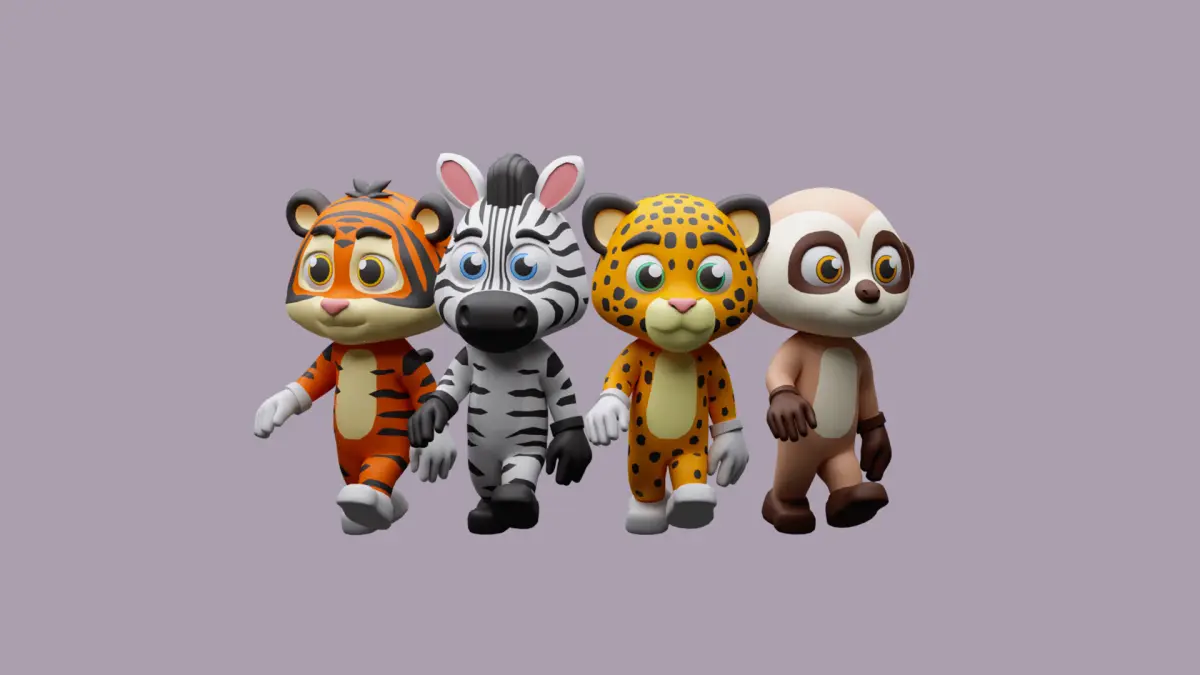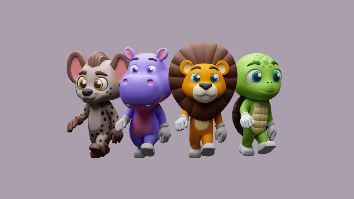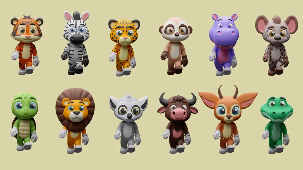 12 cartoon character models african animals in the set:Tiger, lion, zebra, leopard, hyena, lemur, antelope, crocodile, meerkat, turtle, buffalo, hippopotamus.
