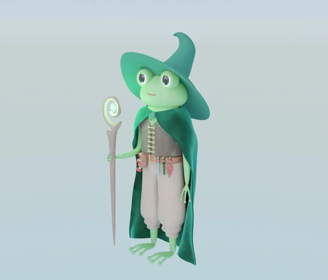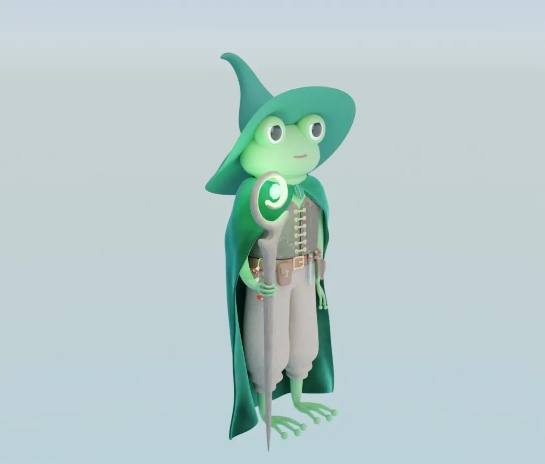 Please enjoy this cute catoon style druid frog character in a cloak and a hat with wooden glowing staff. Please also note that some free textures from BlenderKit were used for this model.
