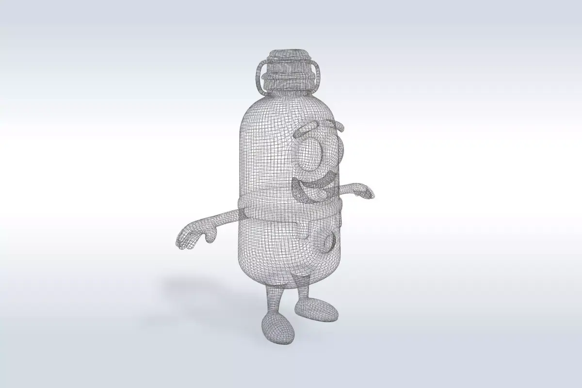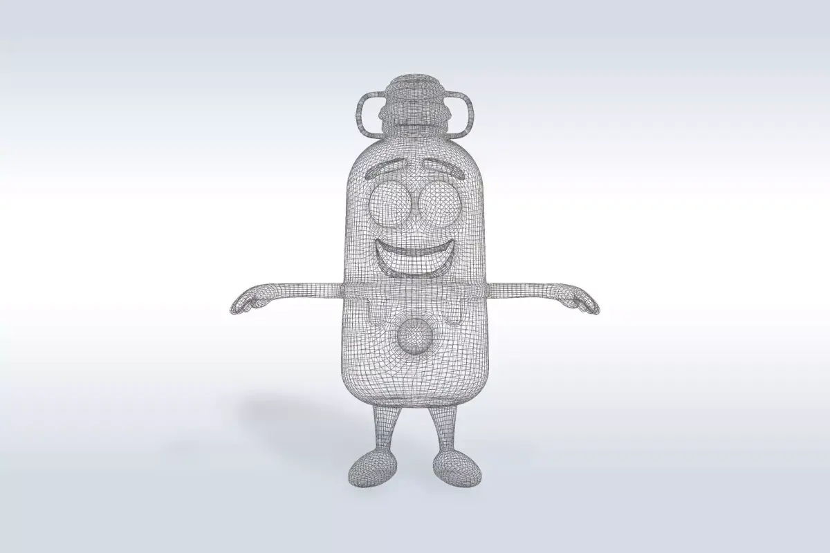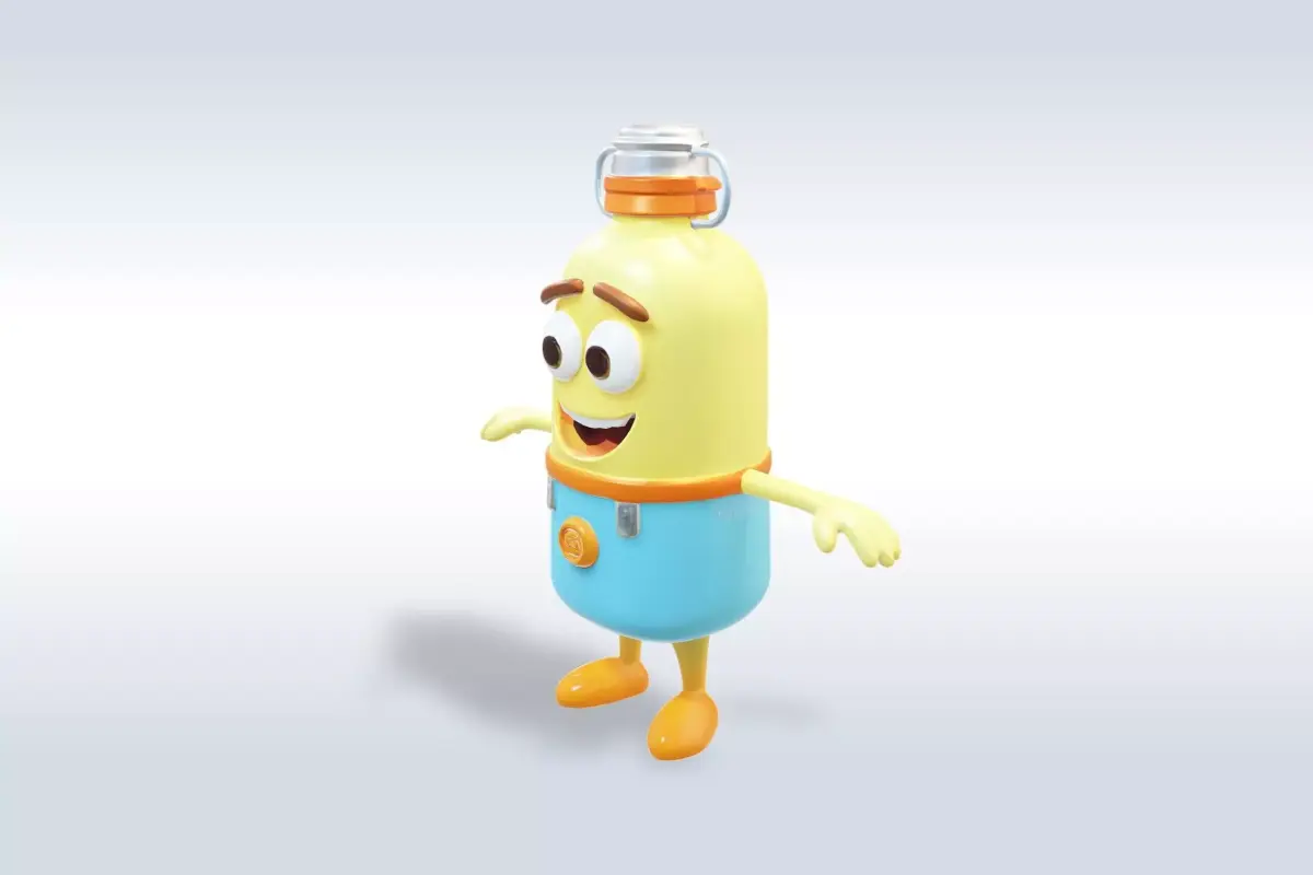 3D model of a flask character dressed in a blue school uniform, suitable for use in various applications such as video games, animations, and visual effects. The character's expression is cheerful and friendly, with a wide smile and big, round eyes, making it ideal for representing a fun-loving and energetic school flask. The character's outfit includes a blue shirt with a yellow tie, a backpack, and orange shoes, adding to the overall impression of a happy and enthusiastic school flask. This model would be perfect for use in educational content, children's apps, or any project that requires a realistic and engaging representation of a young, energetic school flask.