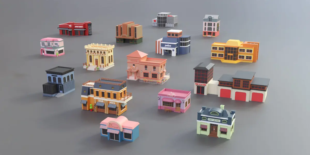 Thank you this package include 15 buildings and 6 cars, objectAll the models can be Drage and dropped to make your own cityThis pack contains:15building 1)hotel 2)book store e 3)boutique 4)bank 5)super market 6)police office 7)café 8)post office 9)school 10)fire station11)cinema 12)hospital 13)bakery 14)restaurant 15)beautyObjects contain:9trees in 2 colors ,6pots , public phone ,mail box, pond , bench ,2tables, 2chairs , 3street lights, turn signal ,trash bin ,bicycle,6cars,bus stationTechnical information:Average tris count:10000LoDs:noNumber of textures: 1Number of materials: 1