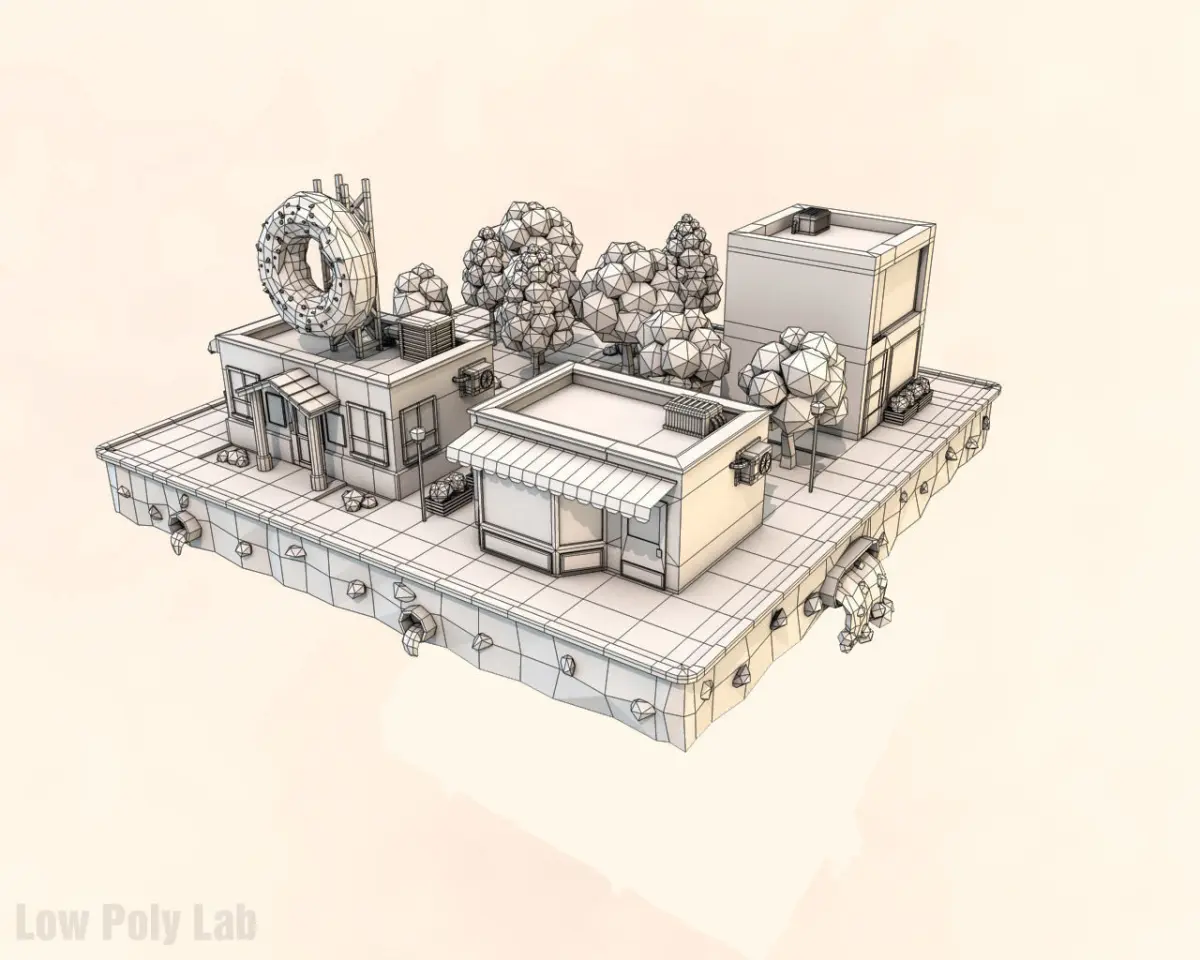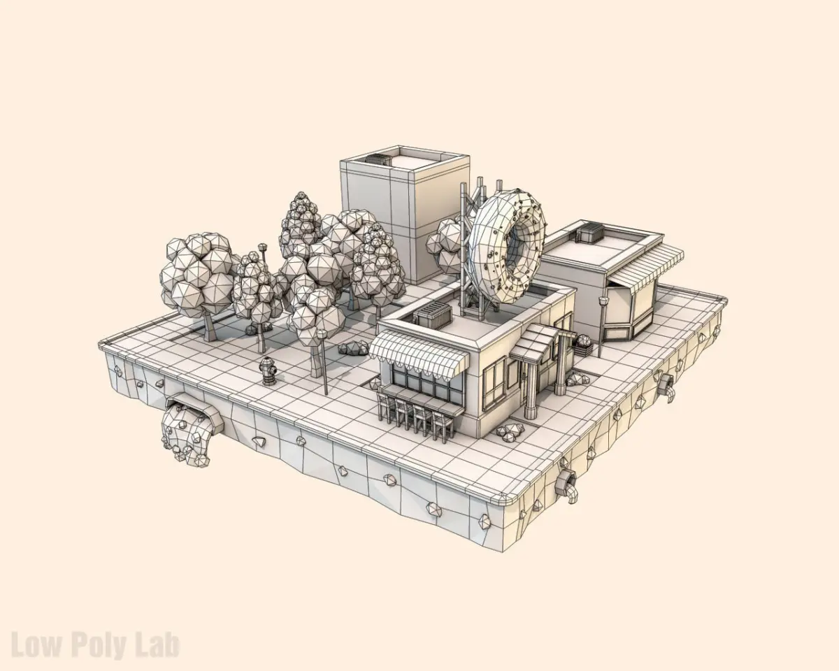 - Low Poly Dount Cafe- Tow Low Poly Buildings- Parts of exterior- Platform