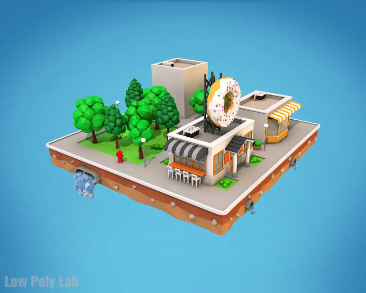 Present to you the low poly city block with donut cafe and two buildings. The 3D models consists of the cafe with big donut on the roof and two buildings with glass sowcases. Also in the low poly city block included the platform, potted flowers, trash cans, street lamps, trees.., as a scene environment. Accurate forms of polygonal shapes, give this model more simplicity and elegance. Model was originally created in Cinema 4D. Rendering standard.