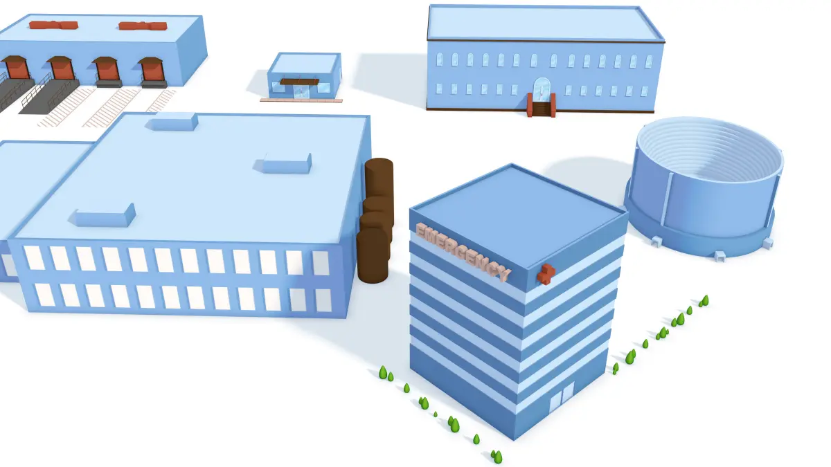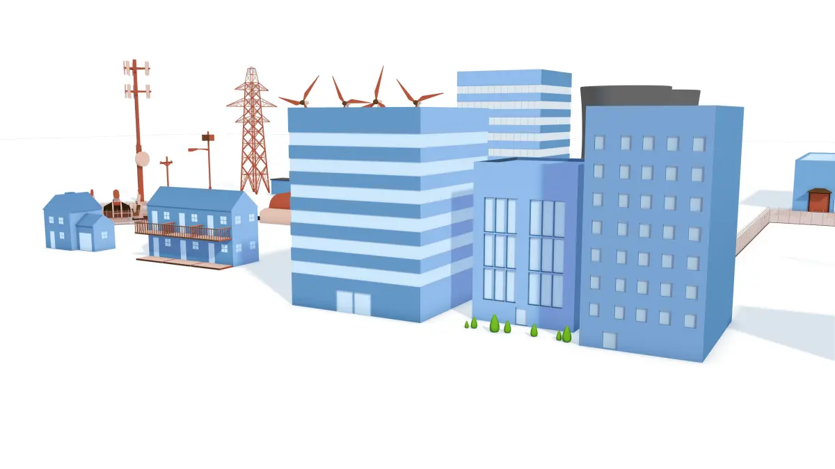 This set includes several office building designs, factories, a power plant, distribution centers, a stadium, a hospital, a school, a single residence, an apartment building, store fronts, an oil plant, windmills, an electrical tower, a 5G smart pole, a telephone pole, and a section of four lane highway with traffic sign.