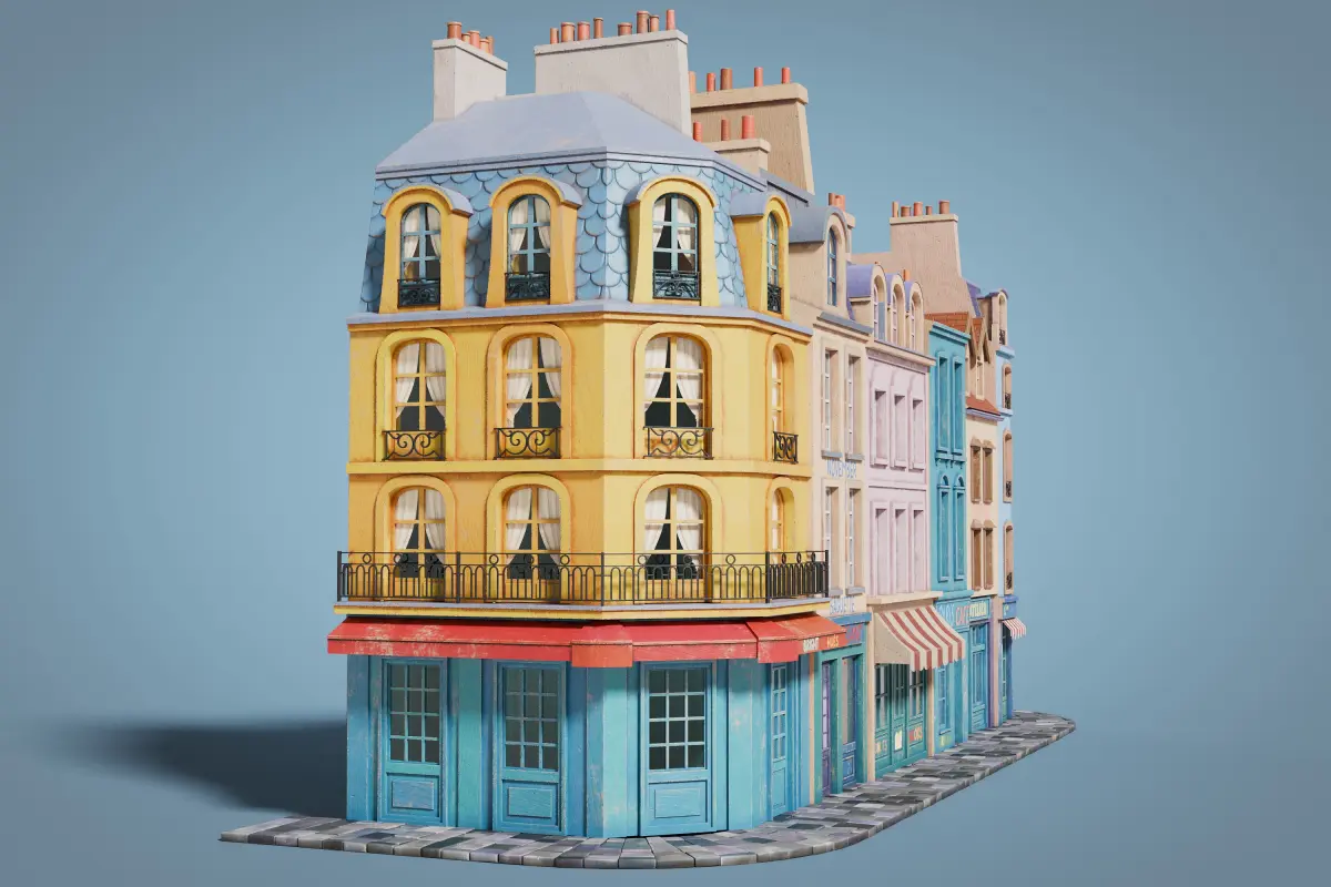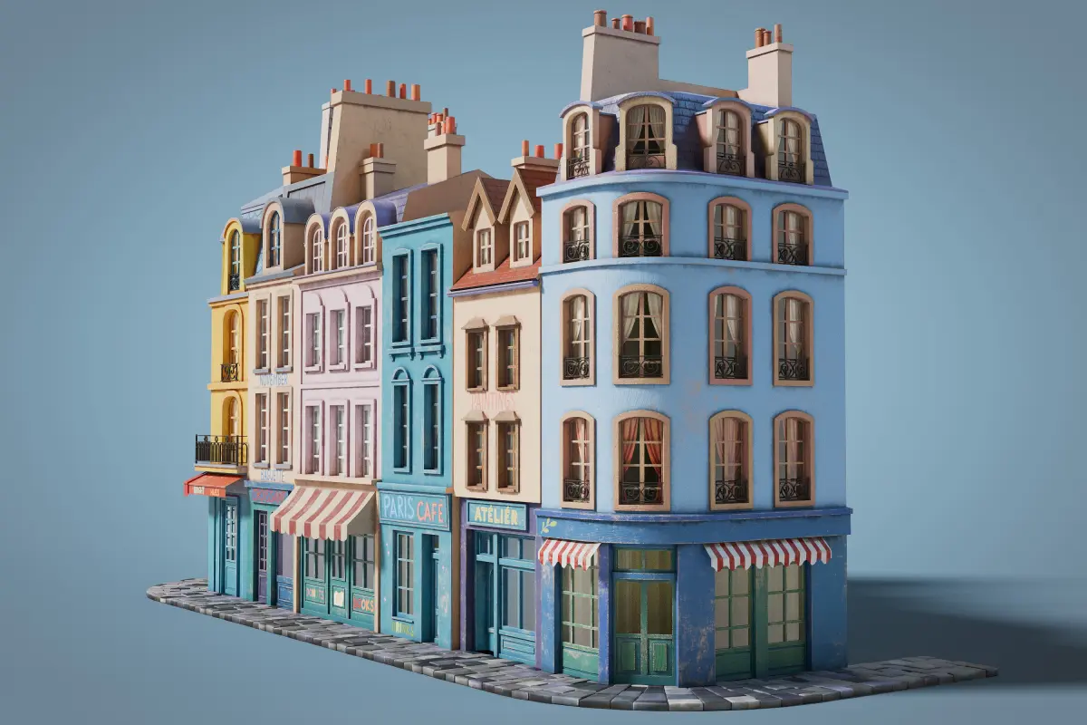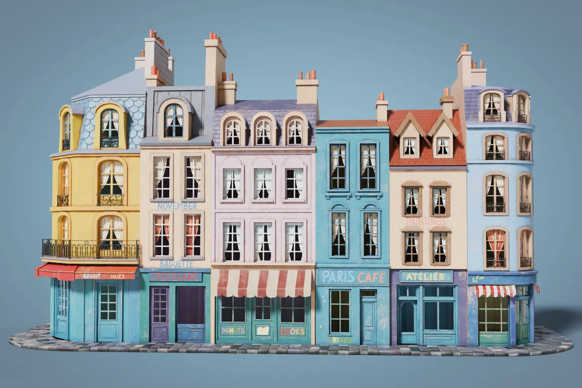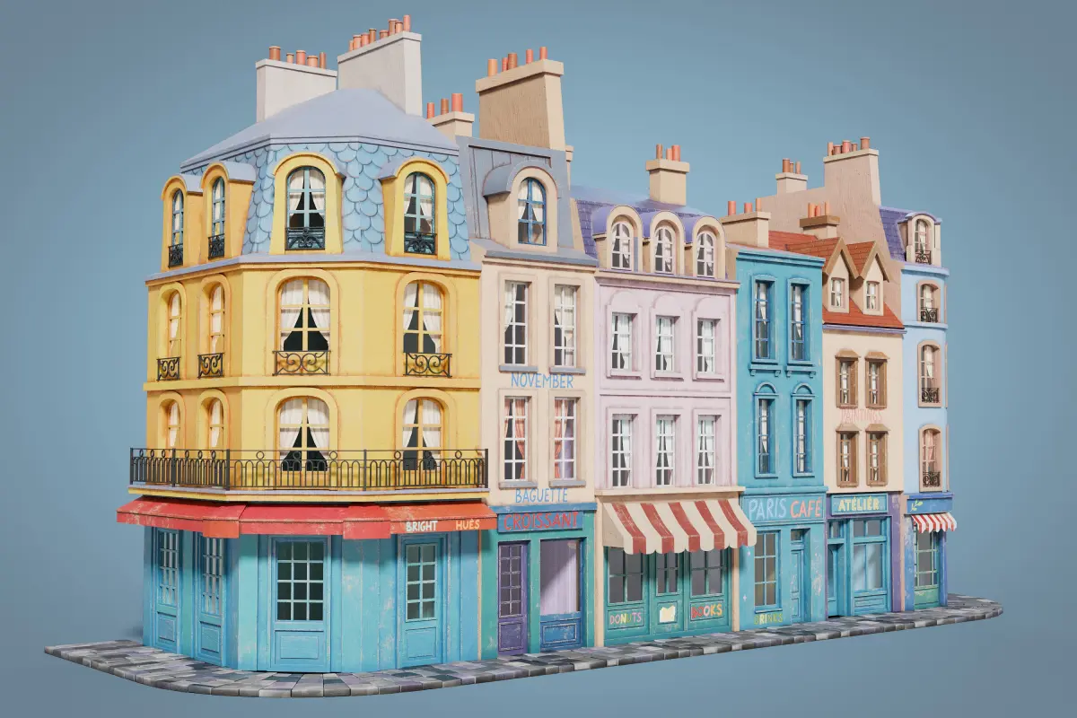This set consists of stylized facades of city buildings, designed in a cozy European style. The models are crafted with attention to detail, reflecting the unique features of French urban architecture. Each building stands out with its own color palette and architectural elements, allowing for the creation of diverse scenes and compositions. The facades include basic interiors with curtains, adding depth and realism to your scenes. The modular sidewalk pieces are included, allowing for flexible and customizable street layouts.