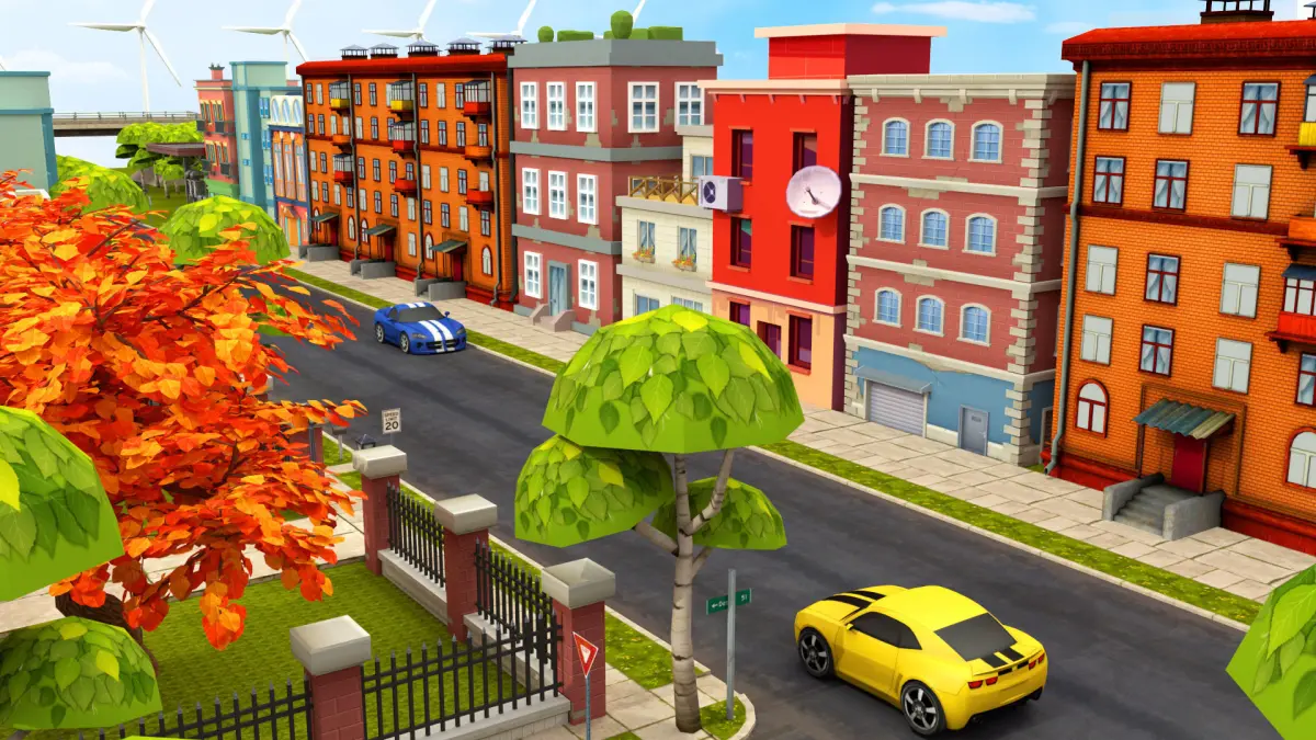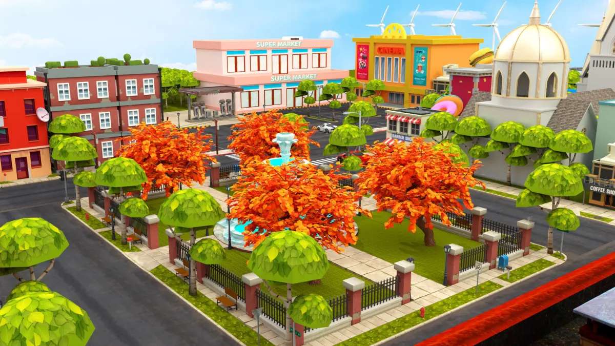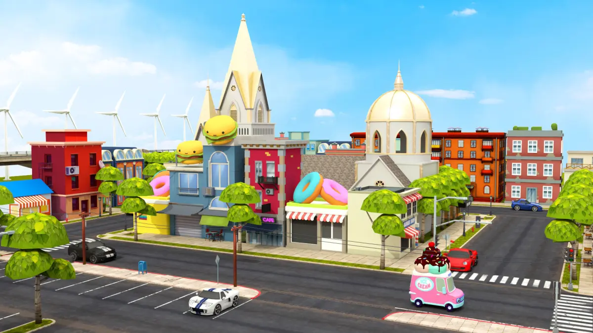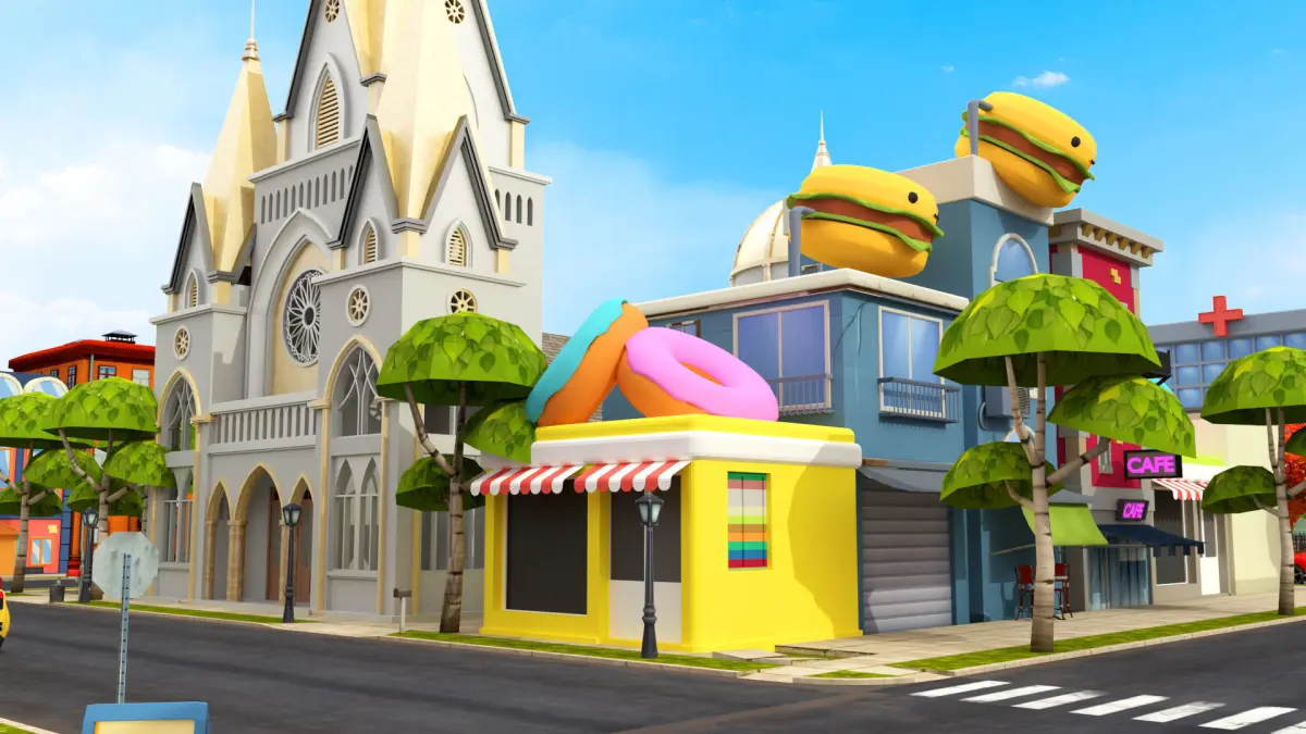 More than 50 animated buildings in the scene