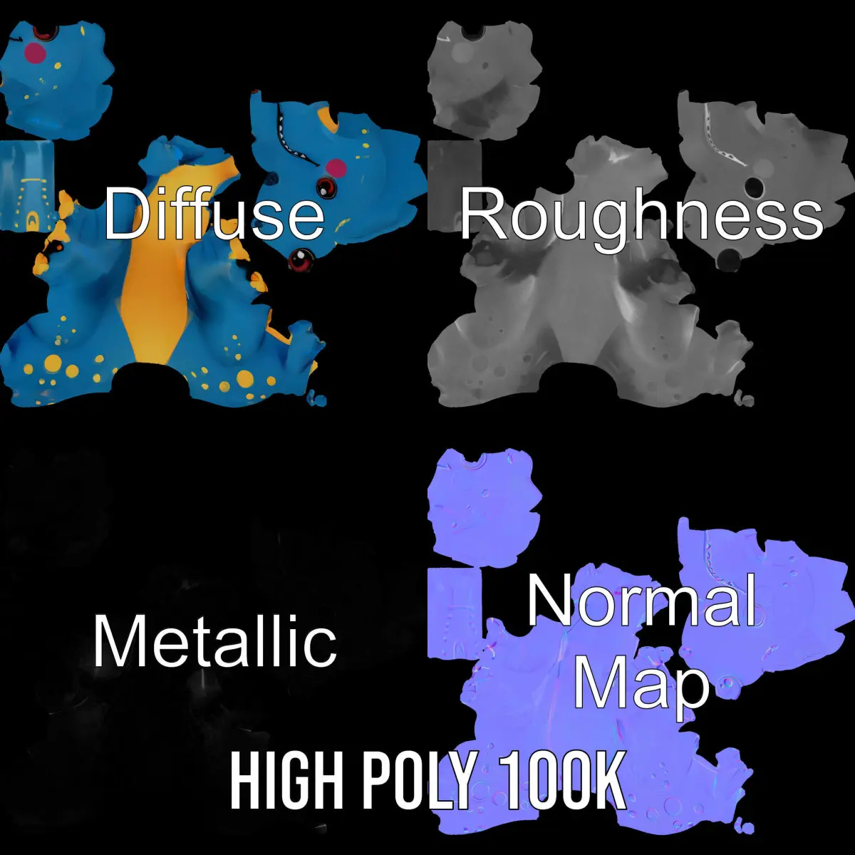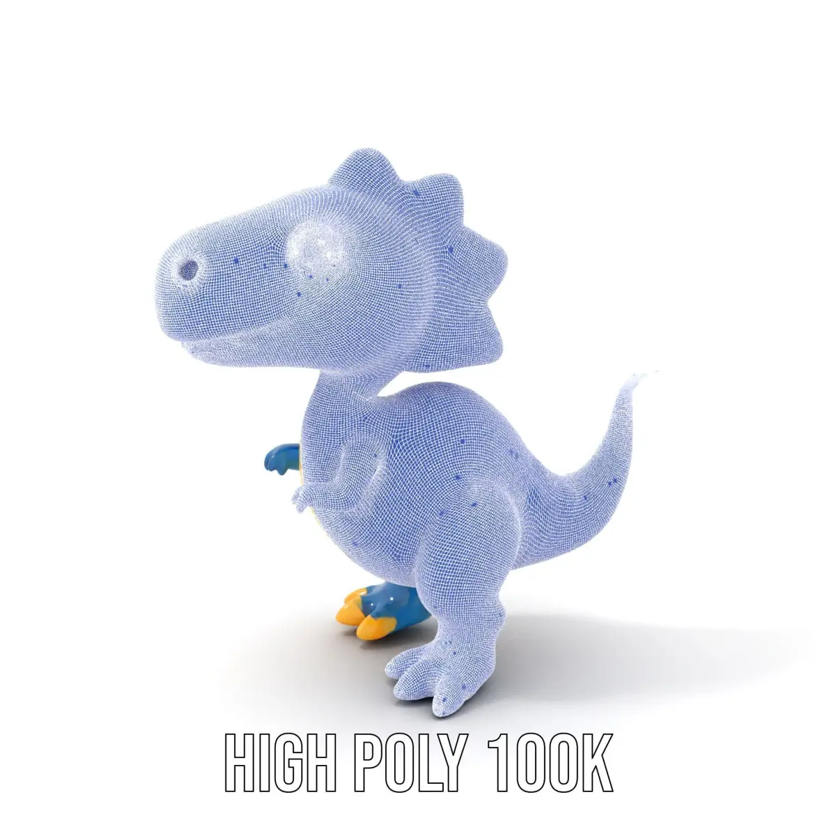 This charming cartoon dinosaur 3D model pack features a playful and colorful design, perfect for engaging digital content. Each model has 3 levels of detail: low-poly (1000 triangles for mobile), middle-poly (10,000 triangles for environment), and high-poly (100,000 triangles), which allows for the use of this model in production rendering (such as 3ds Max, Maya, Cinema4D, Blender, Vray/Corona/Cycles and all others), game engines (Unity and Unreal compatible), and interactive presentations, providing a choice of detail based on the LOD system principle. Ideal for animated films, children's apps, or educational projects. The model's textures are PBR, Diffuse, Normal Map, and reflection/roughness/metallic, suitable for any modern rendering engine. All models are accurately unwrapped with no overlapping UVs. All textures are 4096*4096 in size. The first image is the reference used for creating the 3D model. It is important to carefully evaluate the quality of the model by examining the preview images that display the topology and polygonal mesh. These previews (WIRE and WEB 3D Preview) clearly demonstrate how accurately the model matches the original reference and how well the geometry has been executed. If you like it, please leave a comment and like this model!