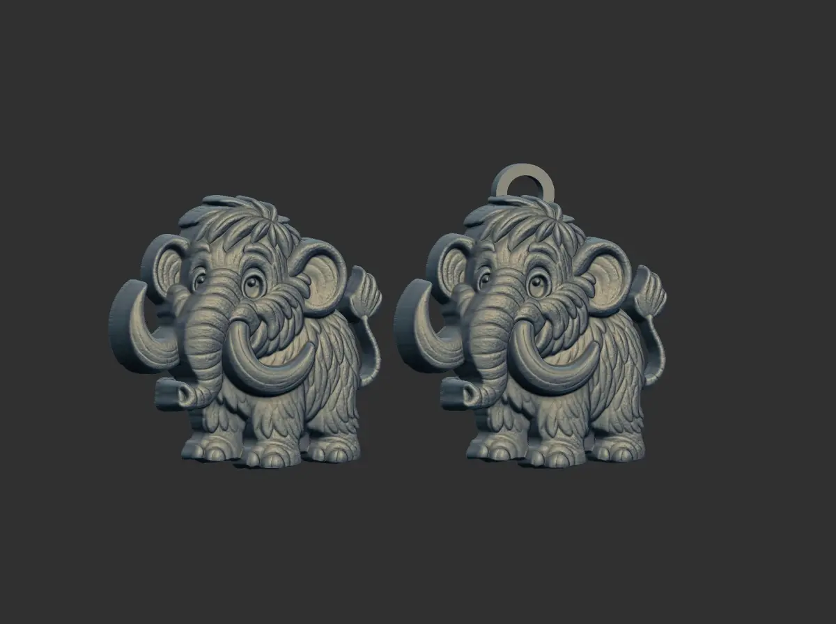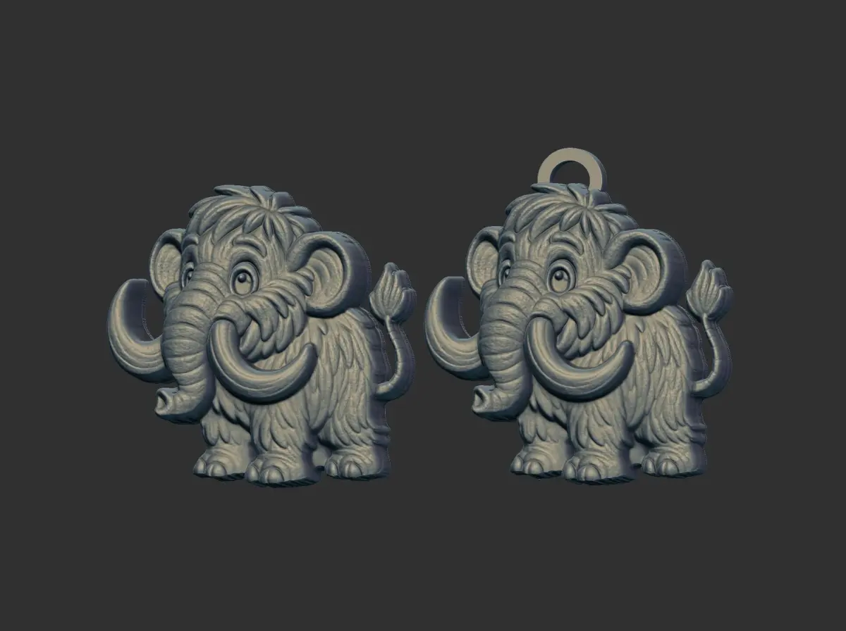The image shows two identical 3D renderings of a cartoon mammoth, likely intended as designs for a pendant or charm. Both mammoths are depicted in a standing position, facing forward with a slight tilt to their heads, giving them a friendly and approachable appearance. Key features include large, curved tusks, prominent ears, and textured fur, all contributing to a stylized yet recognizable representation of a mammoth. The model on the right has a small ring at the top, suggesting it is ready to be hung as a pendant or charm, while the model on the left lacks this feature. The background is a plain dark gray, which helps to highlight the detailed features of the mammoth models.